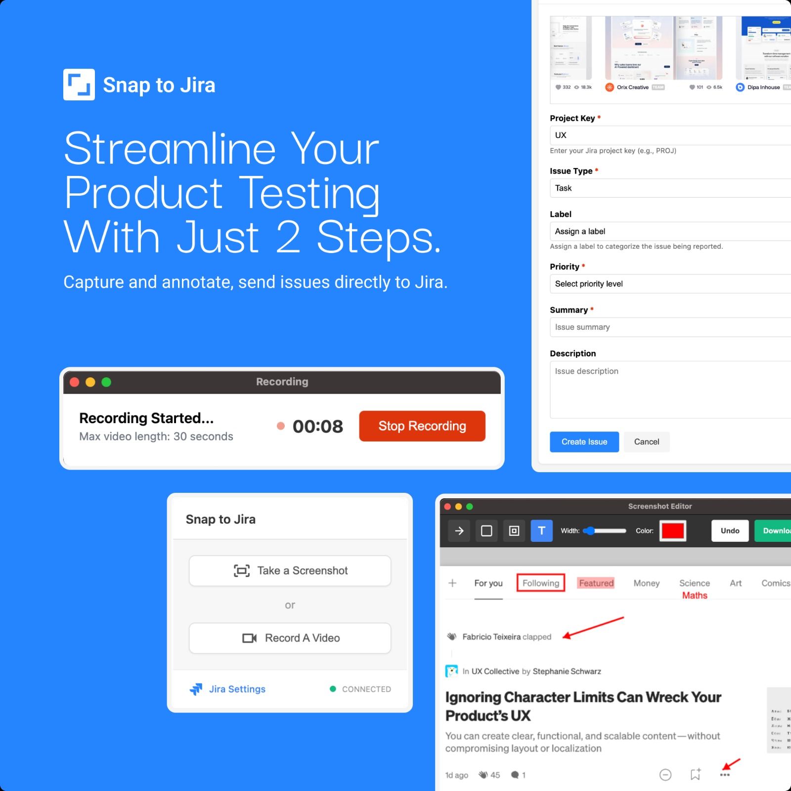 Capture screenshots, record videos, and create Jira issues with one click. Annotate images, add custom labels, and document UI bugs without switching tabs. Perfect for designers, PMs, and QA specialists seeking efficient visual bug reporting.