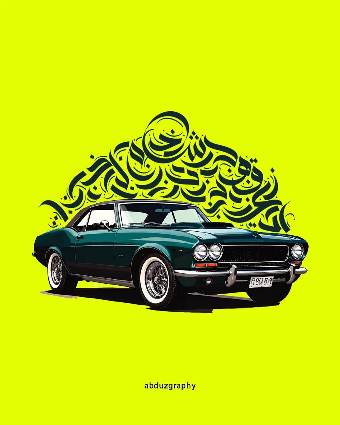 A bold fusion of vintage automotive art and flowing Arabic calligraphy, blending heritage and modern style in one vibrant composition.