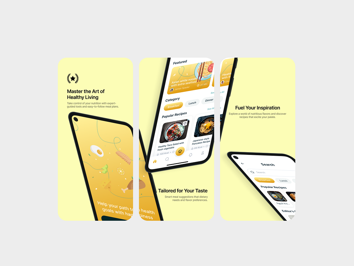 FlavorFlow: Artful Nutrition APP STORE - PLAY STORE SCREENSHOTA bright, energetic culinary interface that treats healthy eating as a creative journey. This UI leverages a warm "Lemon Drop" palette and playful illustrative elements to present expert-guided meal plans and tailored recipe suggestions. With an emphasis on "Fueling Inspiration," the design turns daily nutrition into an accessible, vibrant, and highly personalized digital experience.