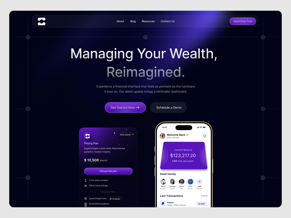 Wealth, Reimagined ✦ Fintech Experience DesignA sleek fintech landing experience crafted with a premium dark aesthetic, glowing gradients, and clean financial dashboards. The goal was to blend trust, clarity, and modern elegance into a minimal interface that makes money management feel effortless and refined.