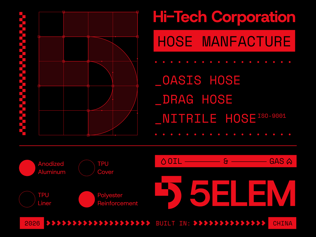 Rejected Brand exploration for 5Elem Hi-Tech, a leading Chinese manufacturer of high-tech industrial hoses. With 40+ years of experience, the company delivers advanced solutions for oil & gas, fire safety, and agricultural sectors across 124 countries. The visual concept reflects engineering precision and tech innovation through a contemporary industrial lens.