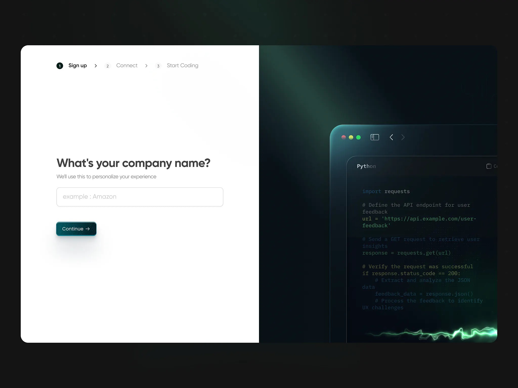 Strategy The onboarding experience is built around reducing cognitive load while maintaining context. Every design decision focuses on getting developers to their workspace faster without sacrificing personalization. Pair minimal data collection with live code background to immediately communicate platform purpose. Use conversational tone to build trust and transparency about data usage. Create visual hierarchy with clean white card against dark gradient backdrop. Show familiar code editor to make developers feel at home. Keep progress indicator simple (3 steps) to set clear expectations without overwhelming. Goal The primary objective is eliminating friction at the most critical conversion point—the moment between signup and active usage. Get developers from signup to first coding session in under 2 minutes. Collect essential information without creating friction at critical onboarding moment. Reduce drop-off rates by avoiding excessive form fields. Maintain user momentum and excitement between signup and product usage. Connect the ask (company name) directly to the benefit (personalized experience). Create smooth transition that feels like progress, not a barrier.