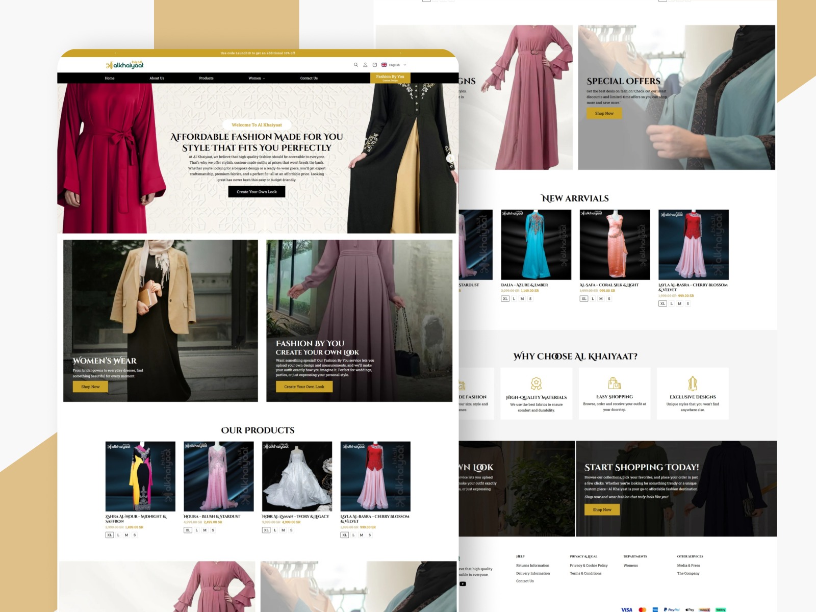 Al Khaiyaat is a sophisticated digital boutique specializing in bespoke modest fashion and luxury abayas. The goal was to provide a "digital tailoring" experience that feels as premium as a physical boutique visit. Key Design Features & Execution: Bespoke Personalization Engine: The centerpiece of the UI is the "Create Your Own Look" module. I designed a seamless flow where users can upload their own design inspirations and measurements, making personalization the core USP. Minimalist Luxury Palette: Used a sophisticated gold, white, and soft-tan palette. This minimalist approach allows the intricate details of the clothing photography to stand out as the primary visual focus. Strategic Product Segmentation: Organized the store into "Trending Designs" and "New Arrivals" using a high-fidelity card layout. This structure encourages exploration while maintaining a clean, uncluttered interface. Localized Global Reach: Optimized the interface for multi-currency (SR/USD) and multi-language support, ensuring the brand can effectively scale within the Middle Eastern and international fashion markets.