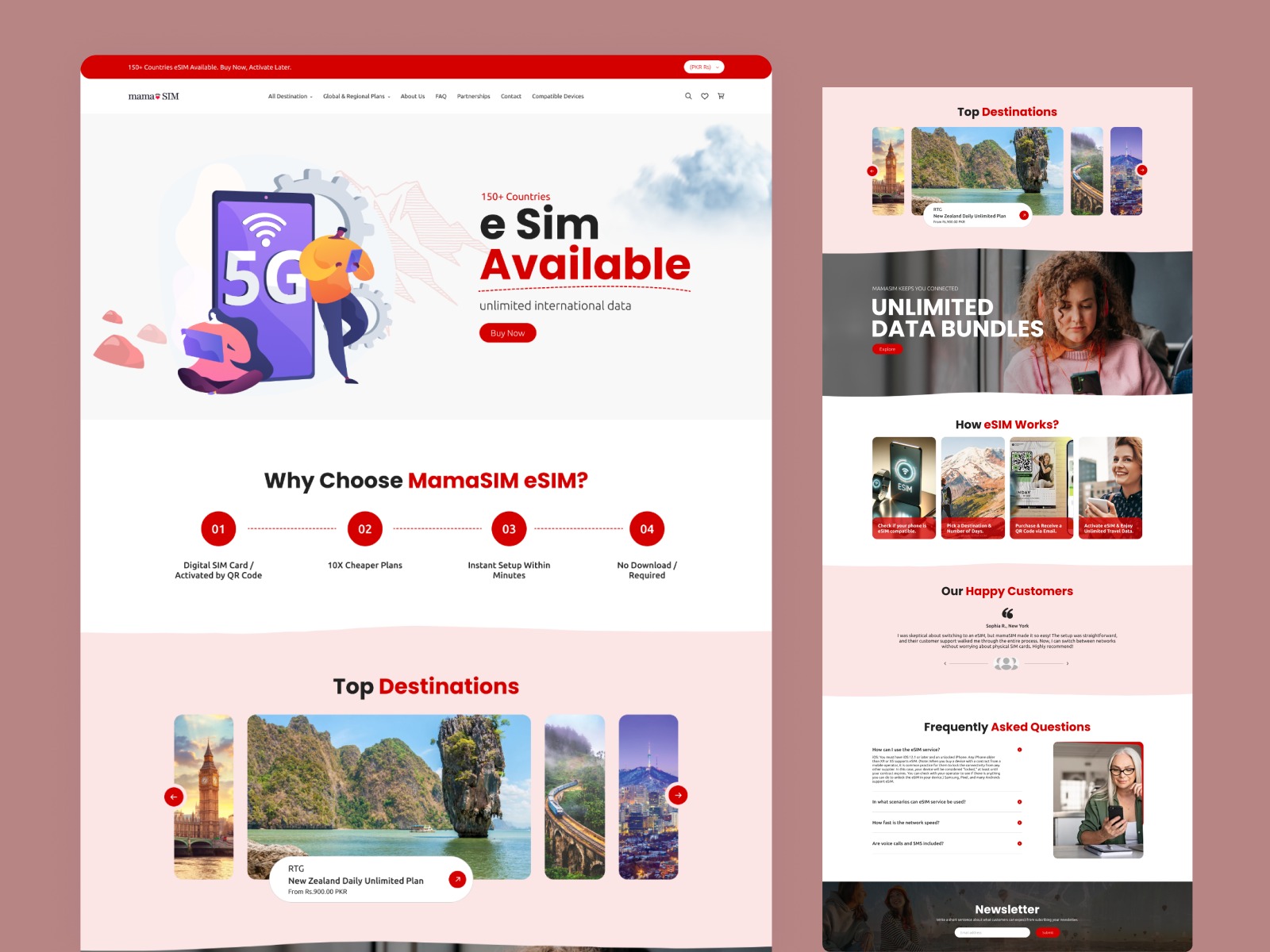 I designed a modern, tech-forward eCommerce platform for MamaSIM, optimizing the global travel connectivity experience through instant digital delivery and seamless UI. Vitality Branding Strategy: I implemented a professional "Vitality Red" and "Modern Grey" palette to establish immediate telecom authority and high-energy trust. Streamlined Destination Matrix: There is a need to simplify complex data plan selections, so I engineered visual product cards and regional filters to reduce user friction during travel preparation. Transparent Activation Flow: I developed structured "How eSIM Works" showcases to provide quantifiable proof of the service's simplicity, ensuring a high-trust digital environment for international travelers.