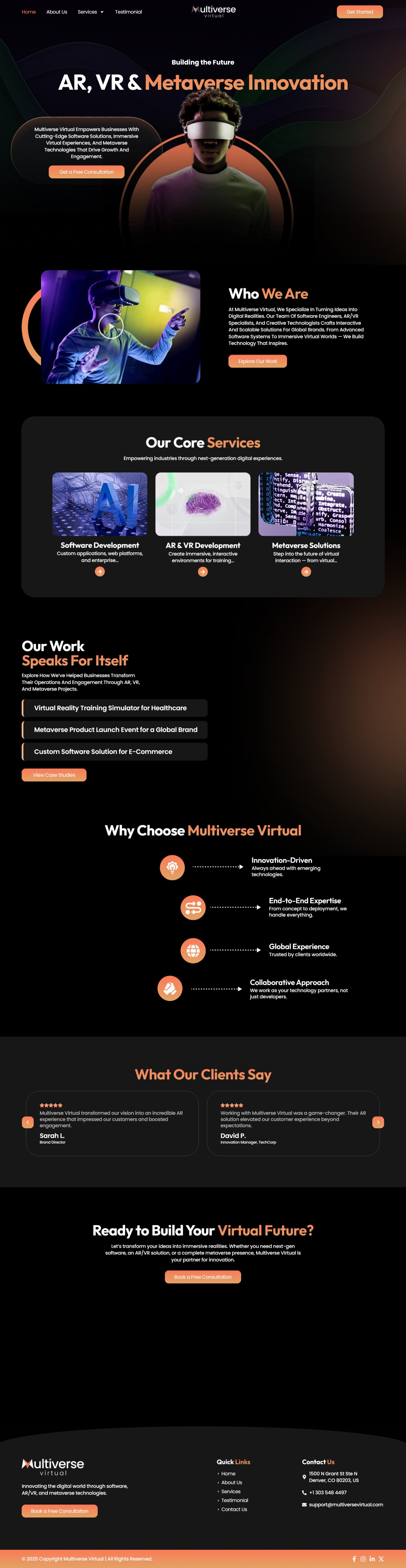 I designed this modern AR, VR, and Metaverse technology website for a client. The design features a futuristic dark UI, strong visual sections, and clear service areas for software development, AR/VR solutions, and metaverse innovation, creating a professional and engaging experience for tech businesses.