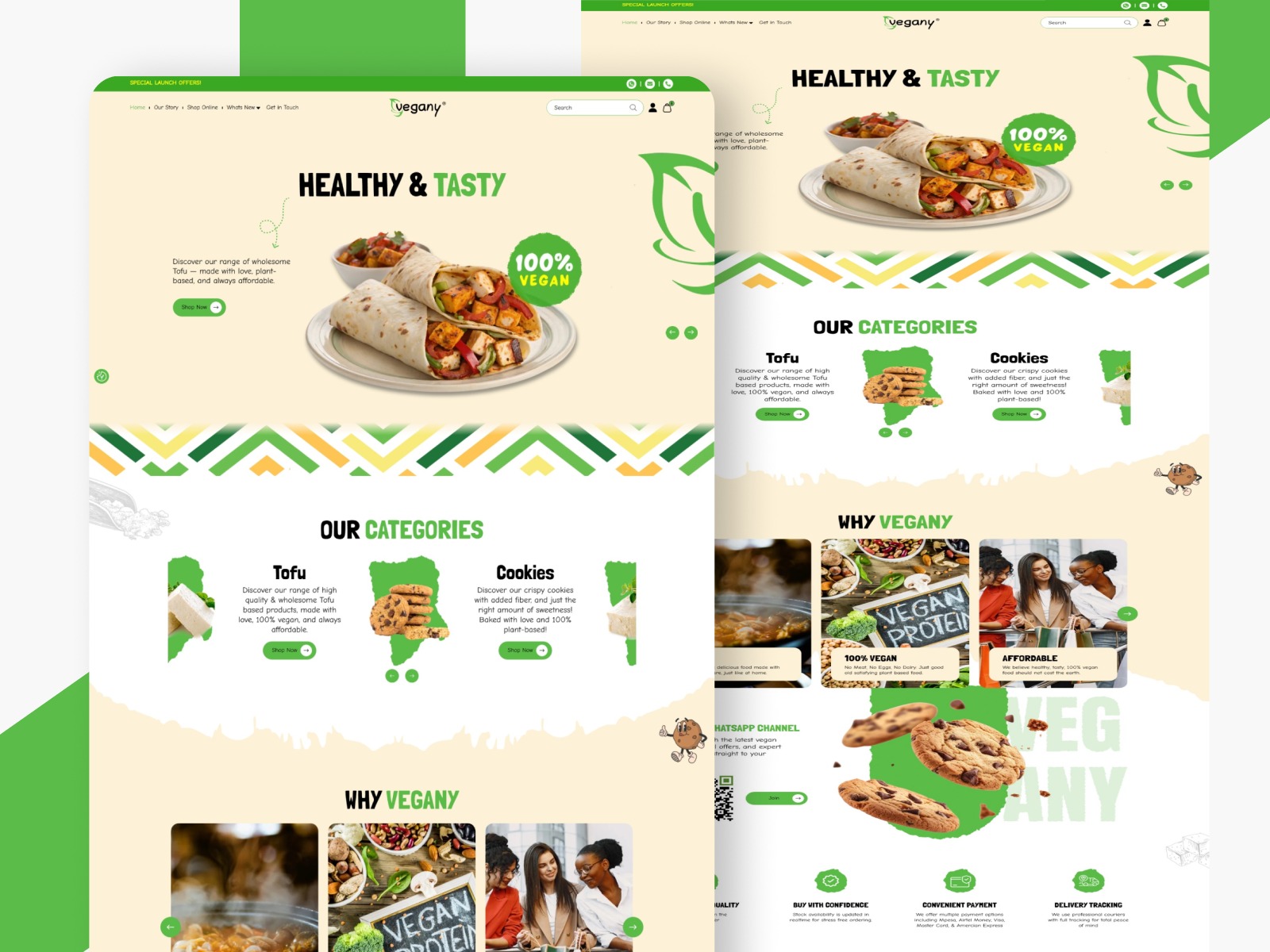 For Vegany, the goal was to create a "Digital Garden" using organic shapes and leaf-inspired motifs. I broke the traditional eCommerce grid by using custom-shaped image masks for the Tofu and Cookie categories. The UX strategy includes a content-to-commerce funnel featuring a video recipe module and a community-driven WhatsApp hub via a custom QR code. It’s an exploration of how color psychology and organic UI can drive trust in the health-conscious market.