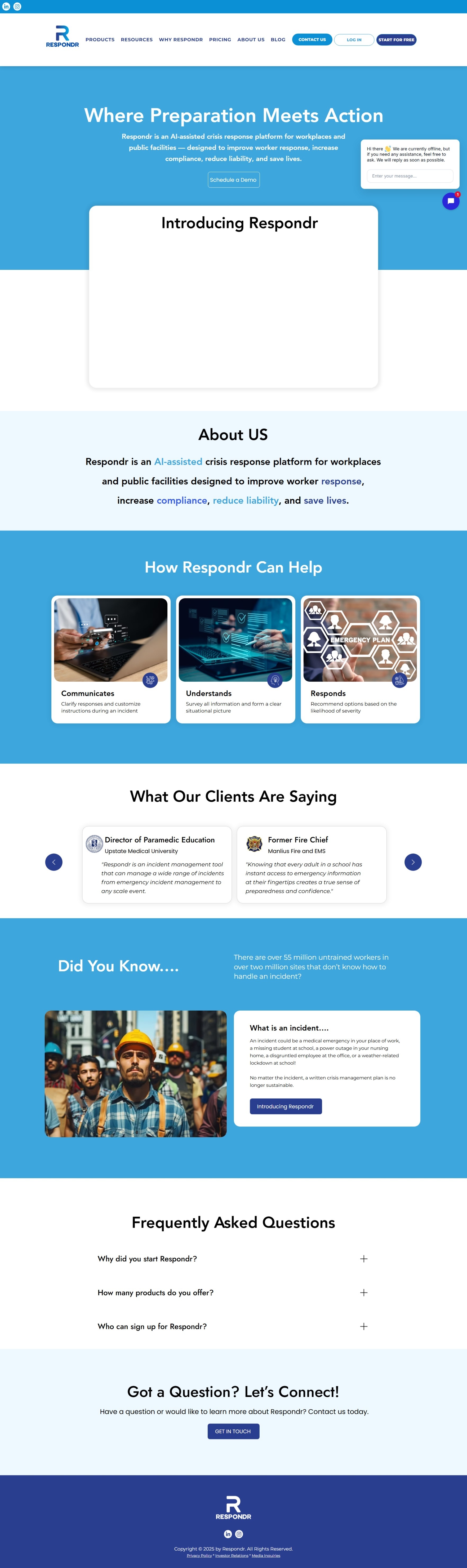 I developed this sophisticated landing page for "Respondr," an AI-assisted crisis response platform designed for workplaces and public facilities. The design highlights key pillars of the service: communication, understanding situational data, and rapid response to save lives and reduce liability. Featuring a clean, trustworthy blue-and-white UI with client testimonials from emergency management experts and a detailed FAQ section. Perfect for showcasing expertise in SaaS development, AI integration, and high-stakes corporate web design.