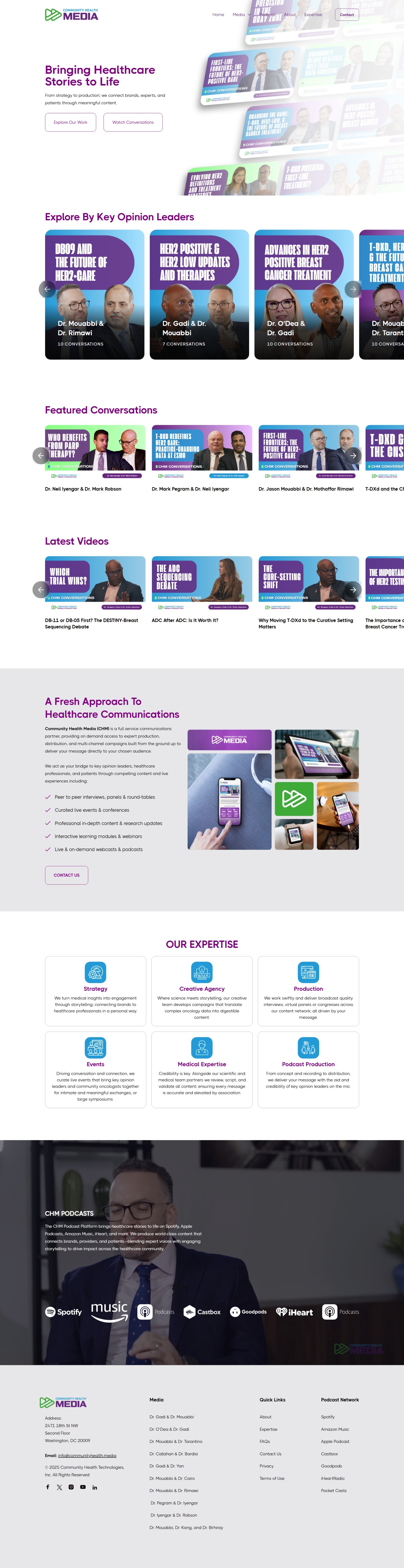 I developed this comprehensive media platform for "Community Health Media," a hub for bringing healthcare stories to life through expert insights. The design features a modern interface for exploring conversations with Key Opinion Leaders (KOLs), featured medical discussions, and latest video content. It includes seamless integration with major podcast networks like Spotify and Apple Podcasts, specifically tailored for the medical community. This project showcases my ability to build complex, content-rich platforms for the healthcare and production industries.