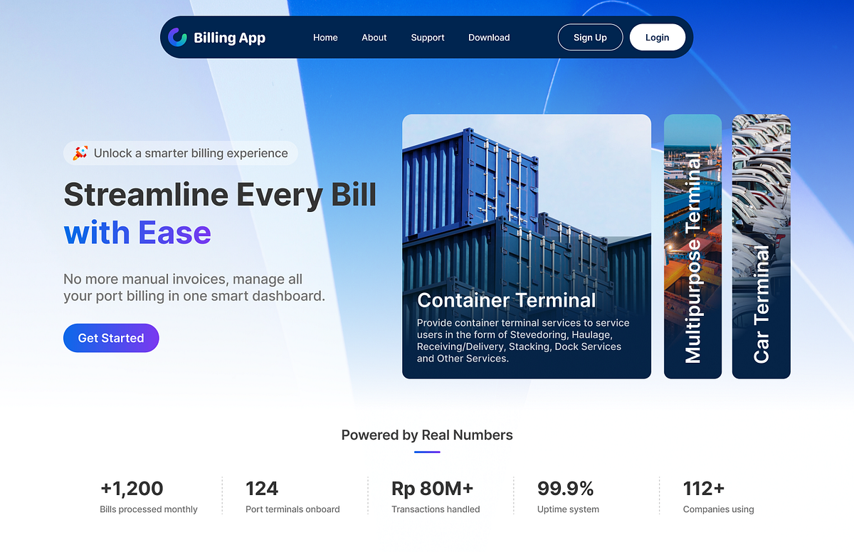 A clean landing page hero section for a port billing web application. It highlights the core value of simplifying all billing activities into one platform, featuring a bold headline, CTA buttons, and card sliders for different terminal services.🎯 Focus / Design GoalSimplified billing access for port users with a modern and trustworthy UI