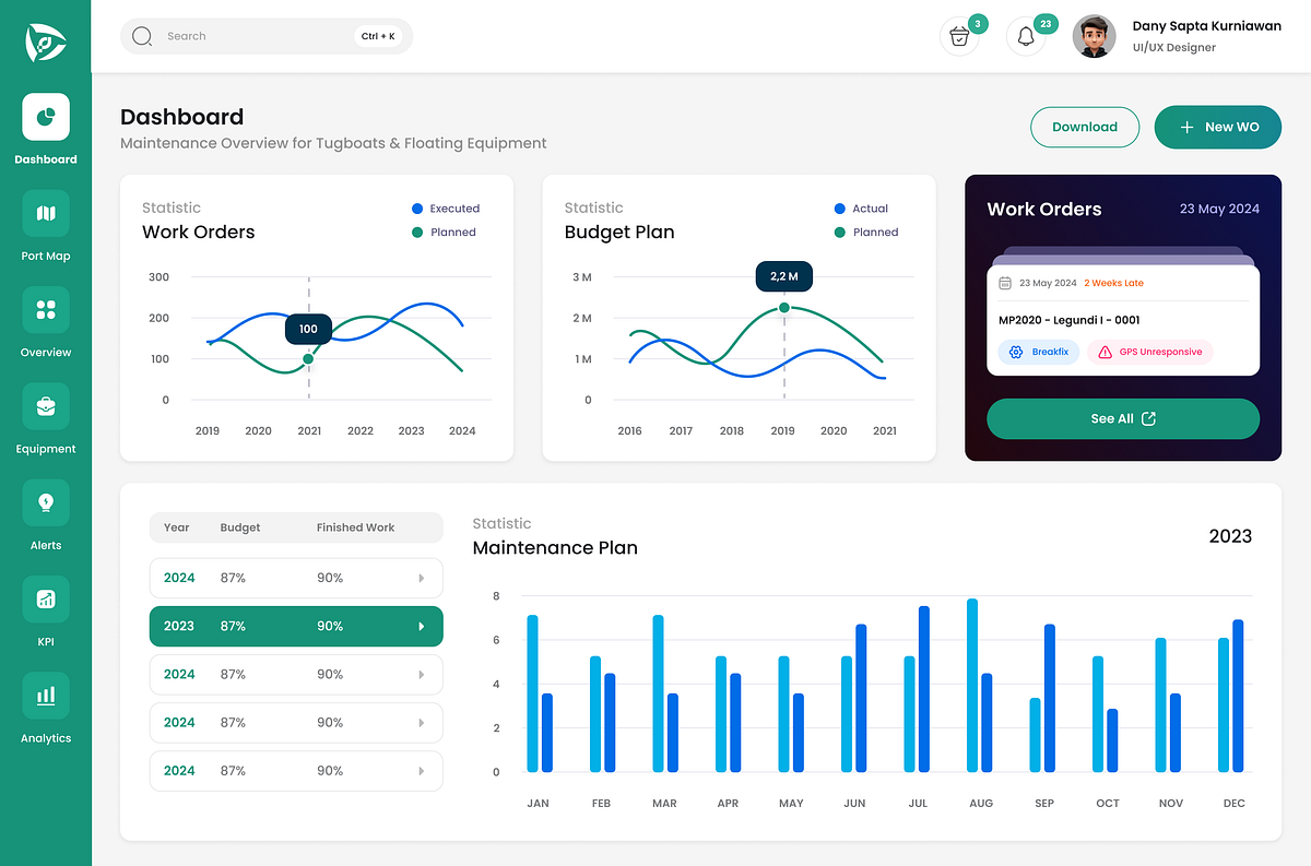A dashboard concept for monitoring maintenance performance of tugboats 🚢It helps operators visualize work orders, budget plans, and maintenance schedule in a simple, clean UI.Focus: quick monitoring, centralized data, smarter workflow.