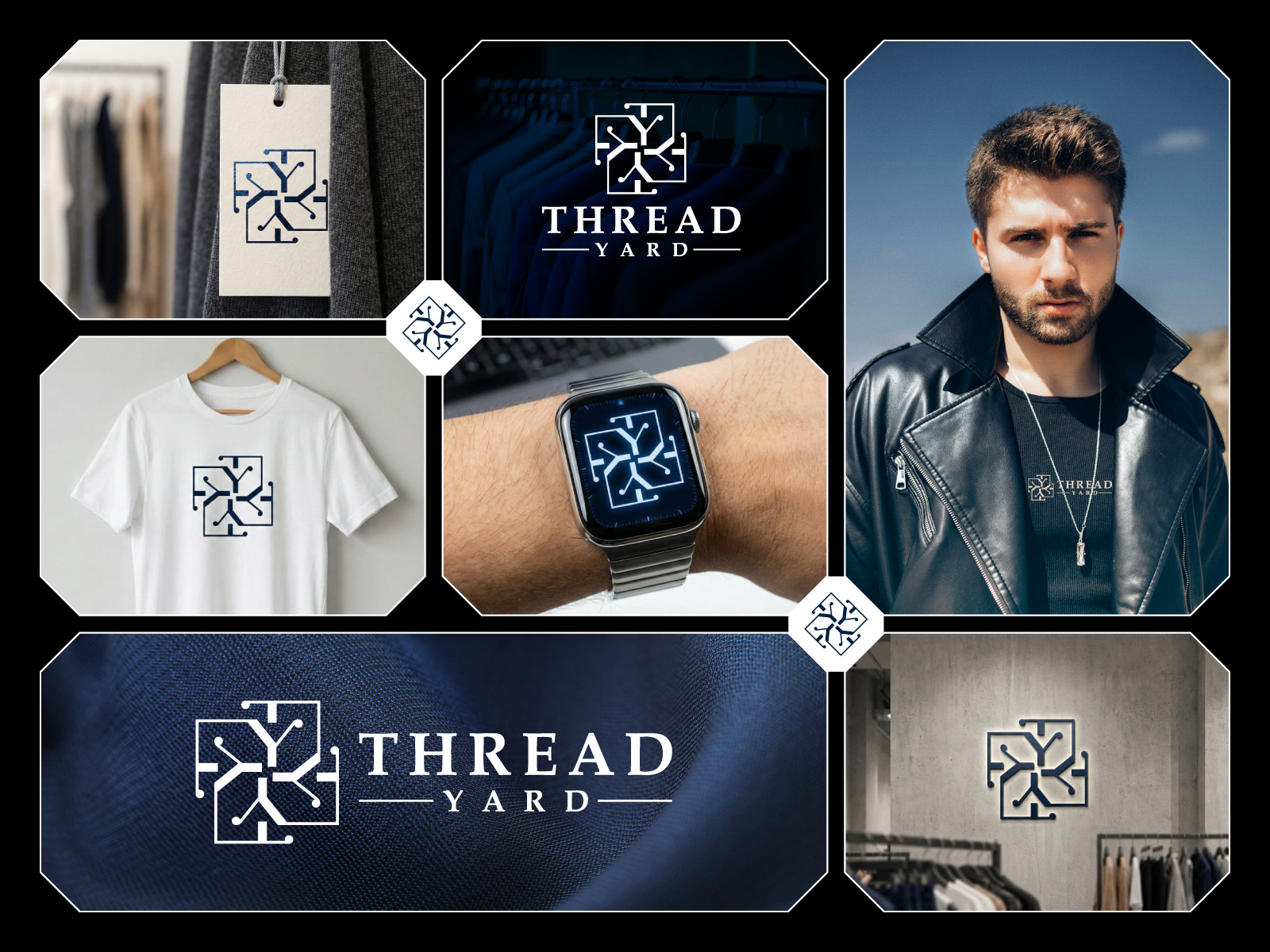 This project features a modern and minimalist brand identity designed for a fashion and clothing brand named 'Thread Yard'. The logo is constructed by creatively combining the letters 'T' and 'Y' in a rotational geometric pattern. The design utilizes clean lines and interconnected nodes, symbolizing the precise stitching of fabrics and the strong connection between the brand and its customers. The rotational symmetry represents balance, quality, and the continuous cycle of fashion trends. The navy blue color palette adds a touch of sophistication, trustworthiness, and luxury, making it suitable for a premium apparel line.