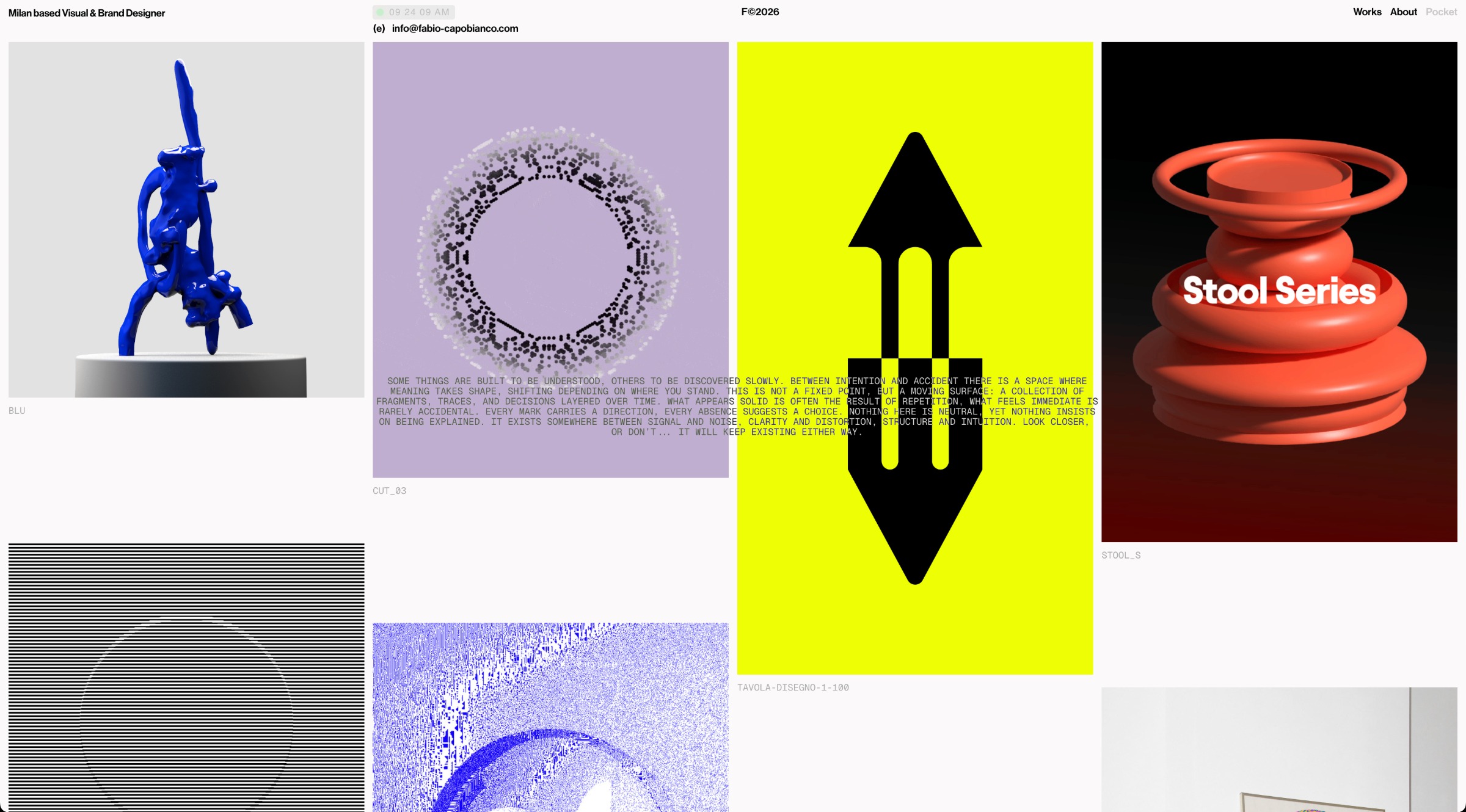 “Side Pocket” is Fabio Capobianco’s archive of fragments, experiments, and materials generated through ongoing exploration.