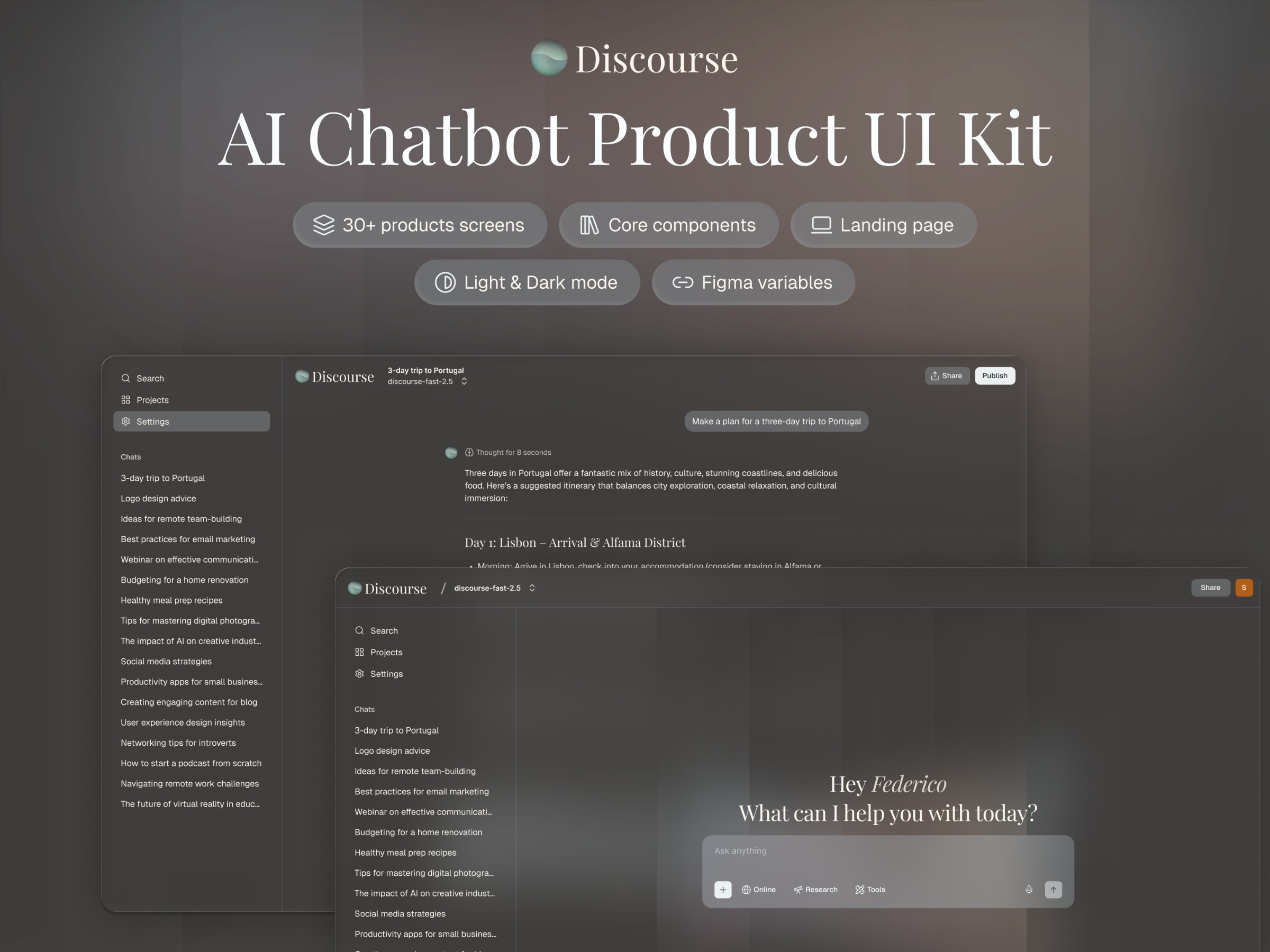 Discourse is a premium Figma UI kit designed for modern AI chatbot products like ChatGPT, Claude, Gemini, and custom AI wrappers.