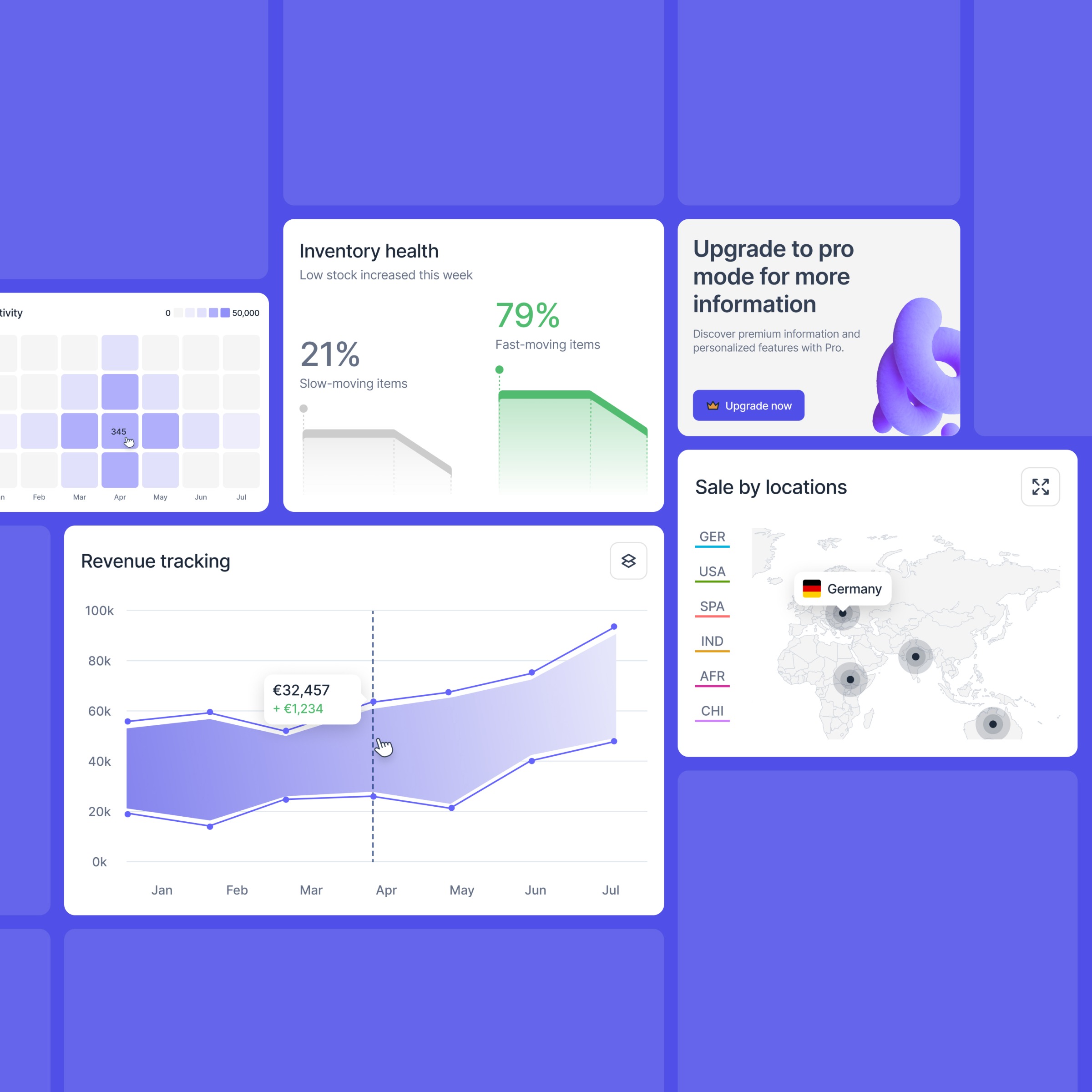 A clean, data-driven dashboard designed to turn complex metrics into instant clarity. Clear visual hierarchy, soft cards, and intuitive charts help teams track inventory health, revenue growth, and sales locations at a glance without overwhelm. Built for fast decisions, not just data display.