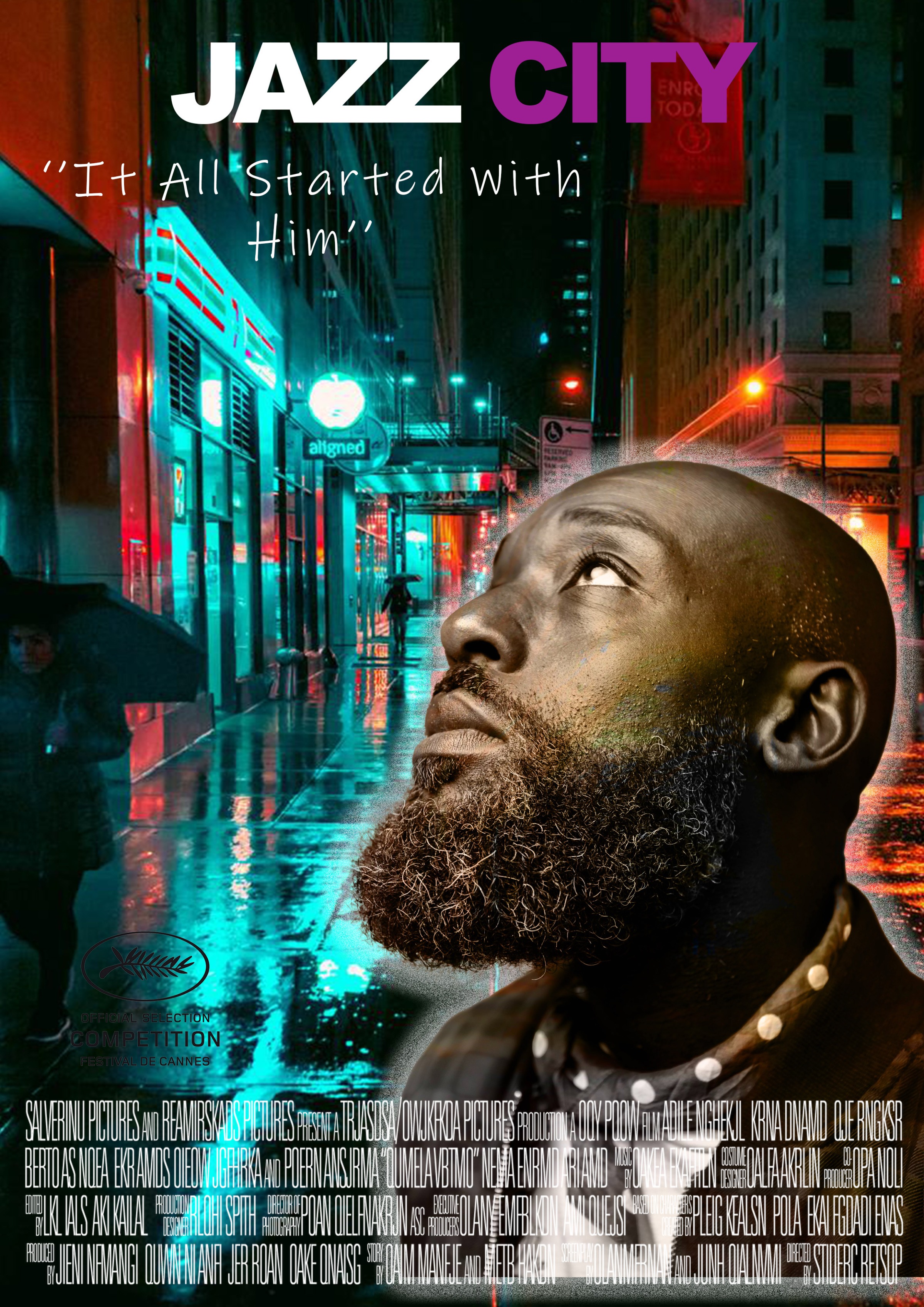 A cinematic poster artwork created in Adobe Photoshop, blending portrait photography with a neon-lit urban nightscape to evoke the soul of jazz culture. The upward gaze of the subject symbolizes origin, inspiration, and legacy, while the rain-soaked city streets reflect rhythm, improvisation, and emotional depth. Color contrast and lighting are used to merge character and environment into a single narrative, creating a timeless homage to music, memory, and urban storytelling.