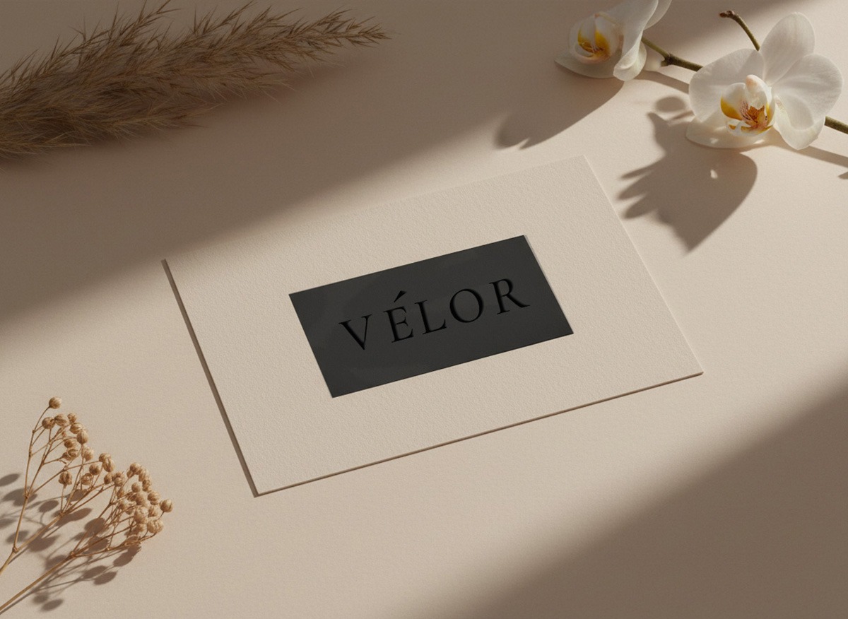 A refined brand card concept designed for the fictional luxury perfume brand VÉLOR. The composition emphasizes minimalism, soft natural lighting, and tactile paper texture to convey elegance, exclusivity, and sensory appeal. Subtle shadows and organic elements enhance the premium atmosphere, aligning the brand with sophistication and timeless beauty. Created as part of a corporate identity and promotional product exploration using Adobe Photoshop.