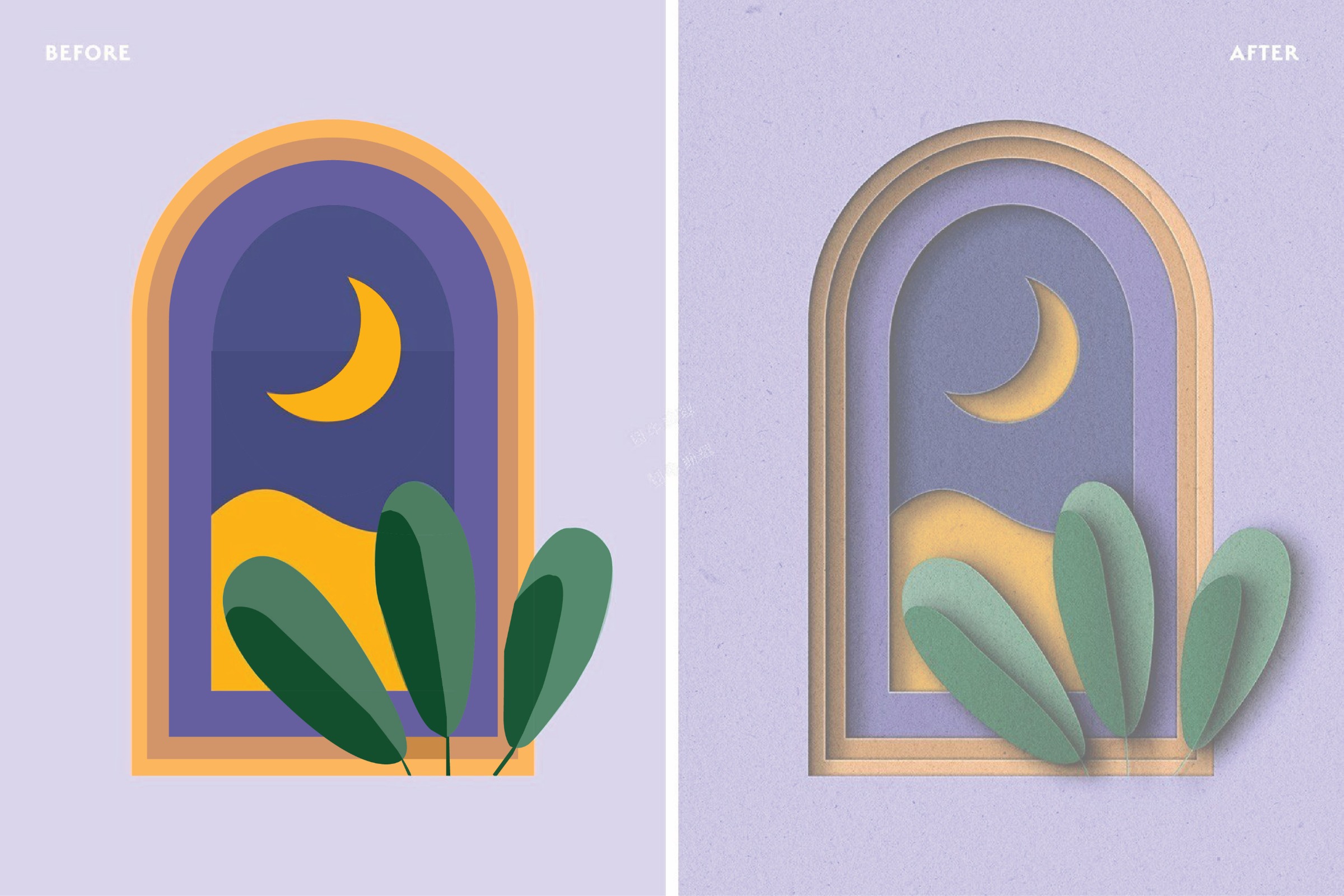 A before-and-after illustration study demonstrating the transformation of a flat vector composition into a more atmospheric and tactile visual. Created using Adobe Illustrator and post-processing techniques, the final version introduces depth through subtle shadows, soft lighting, grain texture, and layered color transitions. The study focuses on enhancing mood and realism while preserving the original composition, showcasing how minimal texture and lighting adjustments can elevate a simple illustration into a more cinematic and emotionally engaging scene.