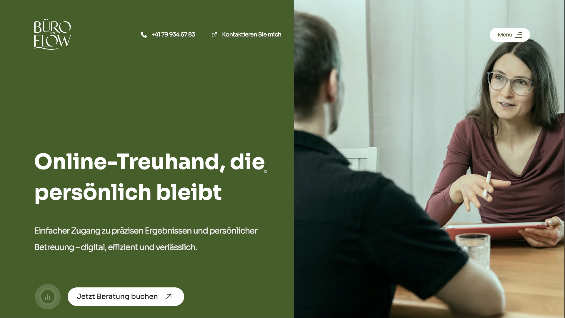 User Interface (UI) design for 'Büro im Flow', an online accounting and consulting ('Treuhand') platform with a personal touch. The project stands out with its two-column layout, where a dark olive green background on the left contrasts with an office environment image featuring a sepia/blue-gray filter on the right. This visual division not only creates a modern and professional aesthetic but also symbolizes the fusion of digital with personal interaction. Clear typography and the use of white for main text ensure high legibility and an intuitive User Experience (UX). The call-to-action button, in a bright lime-green tone, pops, inviting user engagement.