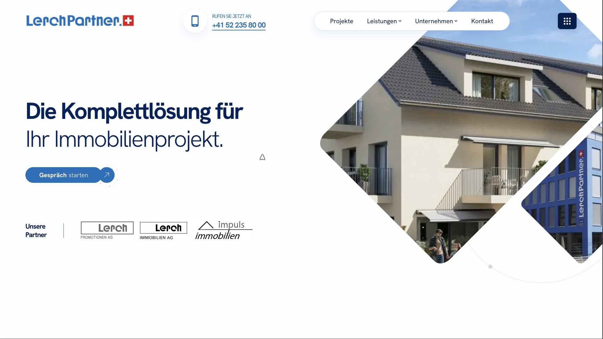 User Interface (UI) design for the Lerch & Partner website, a platform for real estate solutions. The site adopts a clean and professional aesthetic, dominated by a color palette that harmonizes dark blue/navy tones with white and touches of red/orange in the logo and subtle details. The layout stands out with a dynamic visual composition in the upper section, where a large dark blue headline contrasts with a high-quality image of a modern building, organically and geometrically cropped, creating an engaging visual effect. The sans-serif typography is clear and inviting, while the blue call-to-action button with rounded edges and an arrow icon contributes to an intuitive and action-oriented User Experience (UX). The partners section, featuring grayscale logos, maintains visual cohesion.