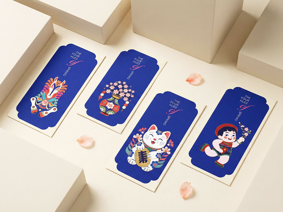 "The Four Hues of Spring" – A luxury red envelope collection for the Year of the Horse 2026. Featuring Gold Foil stamping and modern vector illustration.
