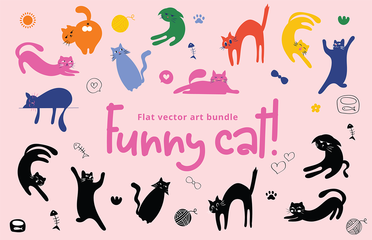 This Funny Cat Flat Vector Art Bundle features adorable cat illustrations in a playful, modern flat style. Each character is full of personality, shown through cute everyday poses, making the collection perfect for packaging, apparel, stickers, social media, and pattern design. All elements are vector-based, fully editable, easy to recolor, and compatible with Illustrator, Affinity Designer, and EPS/SVG-supported software.