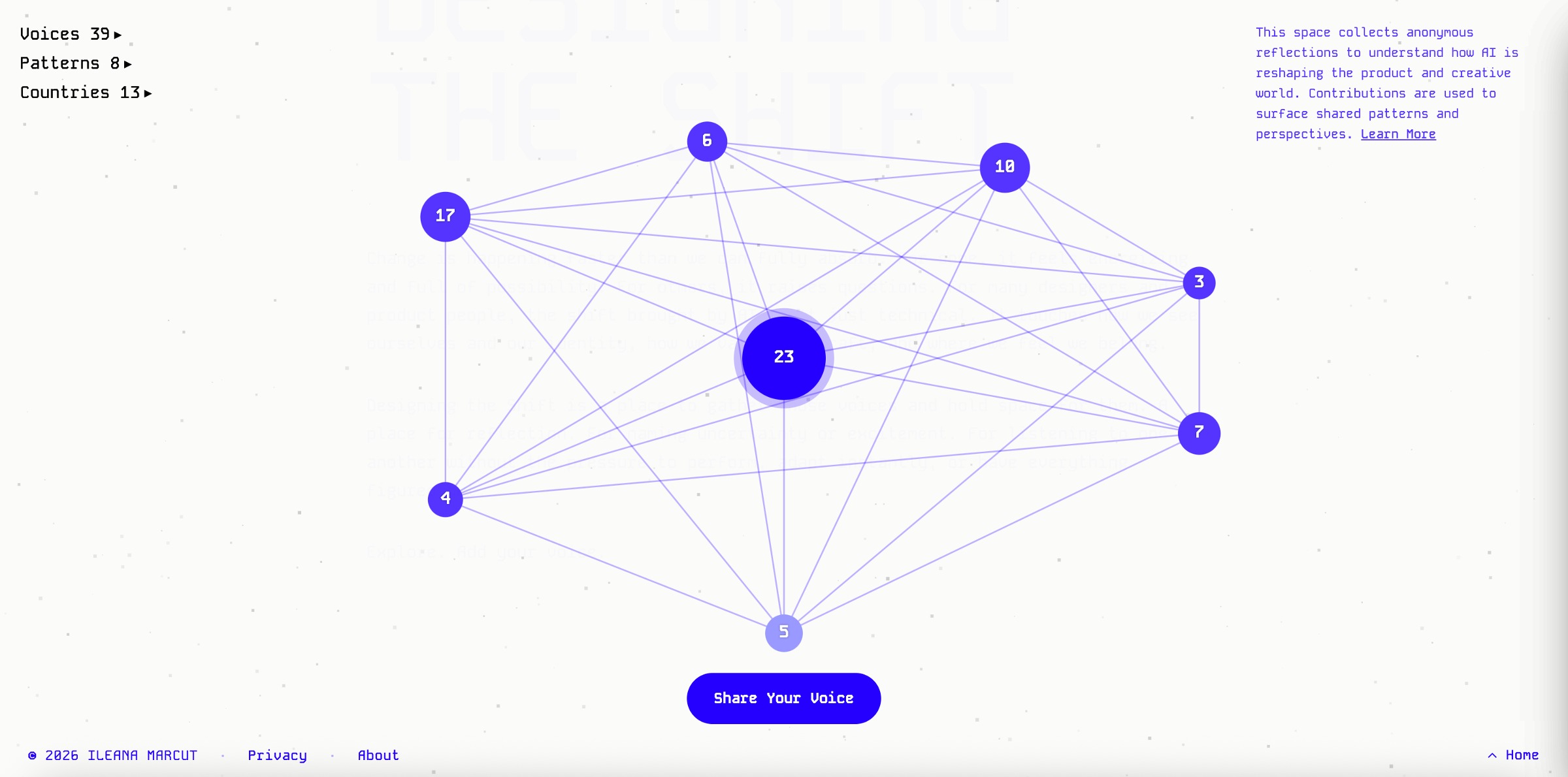 Designing The Shift is a public experimental space for collecting reflections about lived experiences and feeling about the way AI changes how we work and who we become. Each submission becomes part of a shared archive. The system uses AI analysis to identify recurring themes and emerging patterns over time. Tools used: Figma, Claude Code.