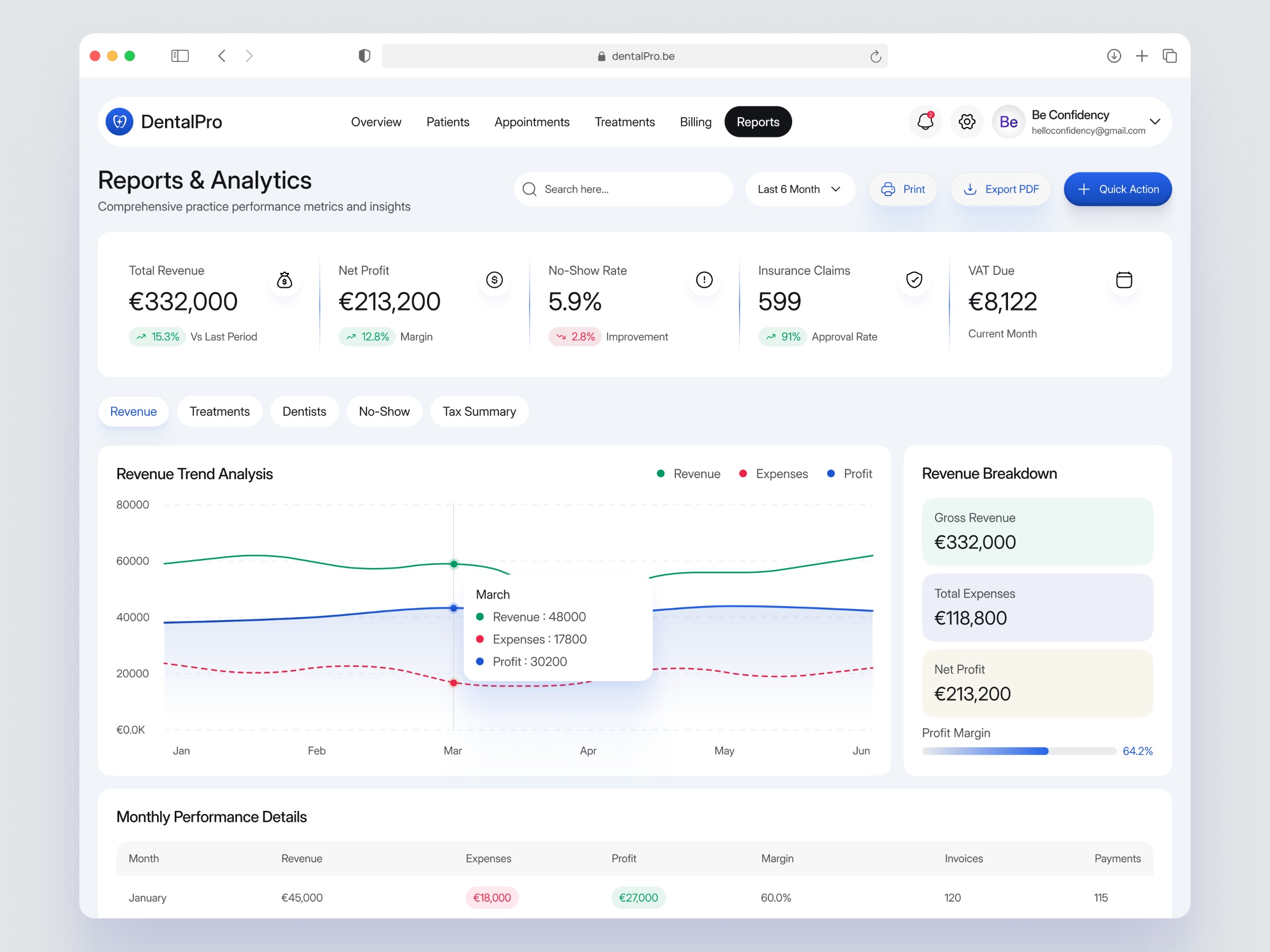 A modern Reports & Analytics dashboard designed for dental practice management platforms and healthcare SaaS products. This interface provides clinics with clear financial insights, revenue tracking, and performance analytics to help dental teams understand how their practice is performing over time. The dashboard highlights key metrics such as total revenue, net profit, insurance claims, VAT due, and no-show rates, allowing clinic managers to quickly evaluate operational performance. Interactive charts and monthly breakdown tables help visualize trends in revenue, expenses, and profit, making complex financial data easier to understand. The goal of this design is to help dental clinics make data-driven decisions, improve operational efficiency, and monitor business performance through a clean and intuitive analytics experience. Available for Healthcare SaaS & Dashboard Design Projects. If you're building a healthcare platform, clinic management system, or analytics-driven SaaS product and need a modern, scalable dashboard interface. Feel free to reach out. I’d love to collaborate on your next product design project.