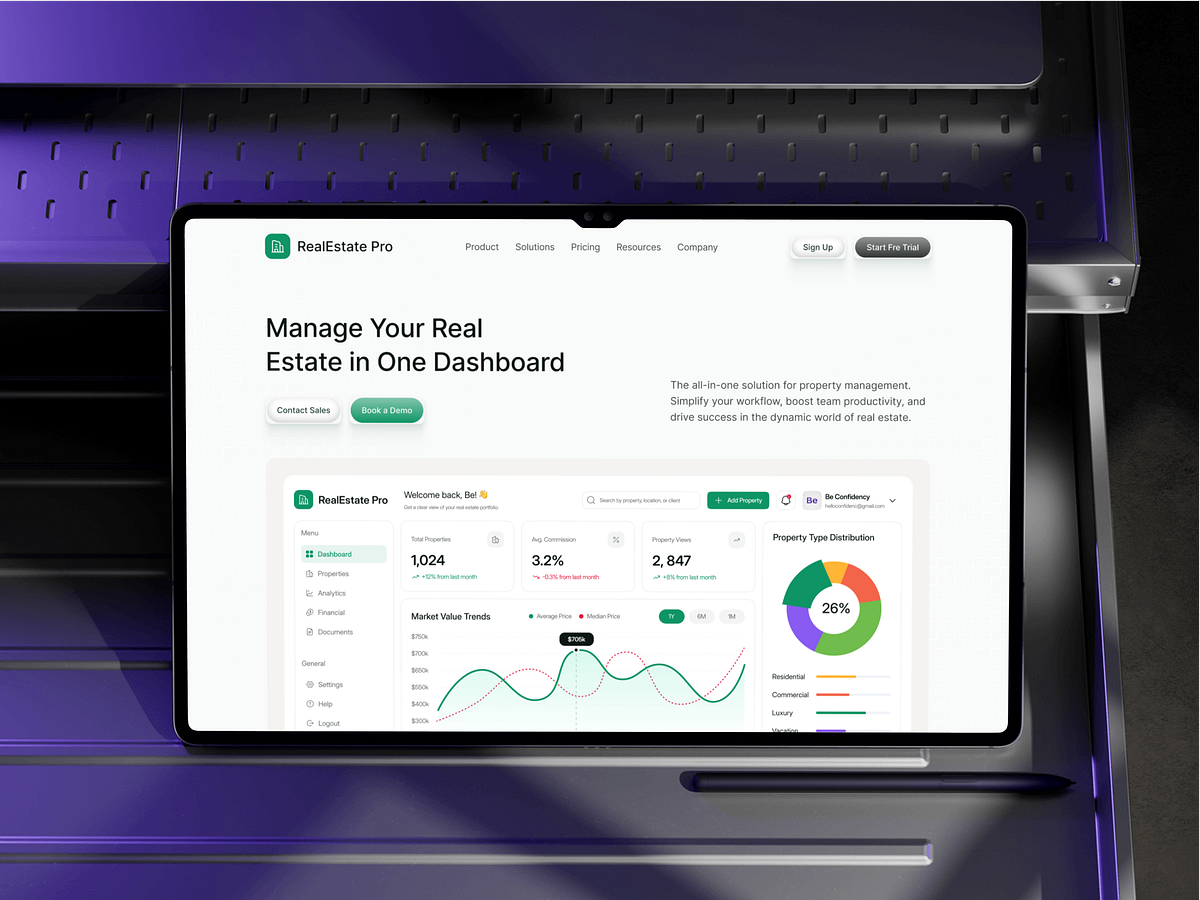 A modern SaaS website UI/UX design for a property management platform. The layout highlights core features, real-time dashboard previews, market analytics, and property performance metrics within a clean, conversion-focused interface.Real estate agencies, property managers, brokers, and real estate startups looking for a scalable digital platform to manage listings, monitor performance, and streamline operations.Property management workflows are often fragmented across spreadsheets, CRMs, and disconnected tools. This website positions RealEstate Pro as an all-in-one solution, clearly communicating value, simplifying complex data into digestible visuals, and guiding users toward demos and trial sign-ups with confidence.Available for new projects.Feel free to reach out, and Let's get started
