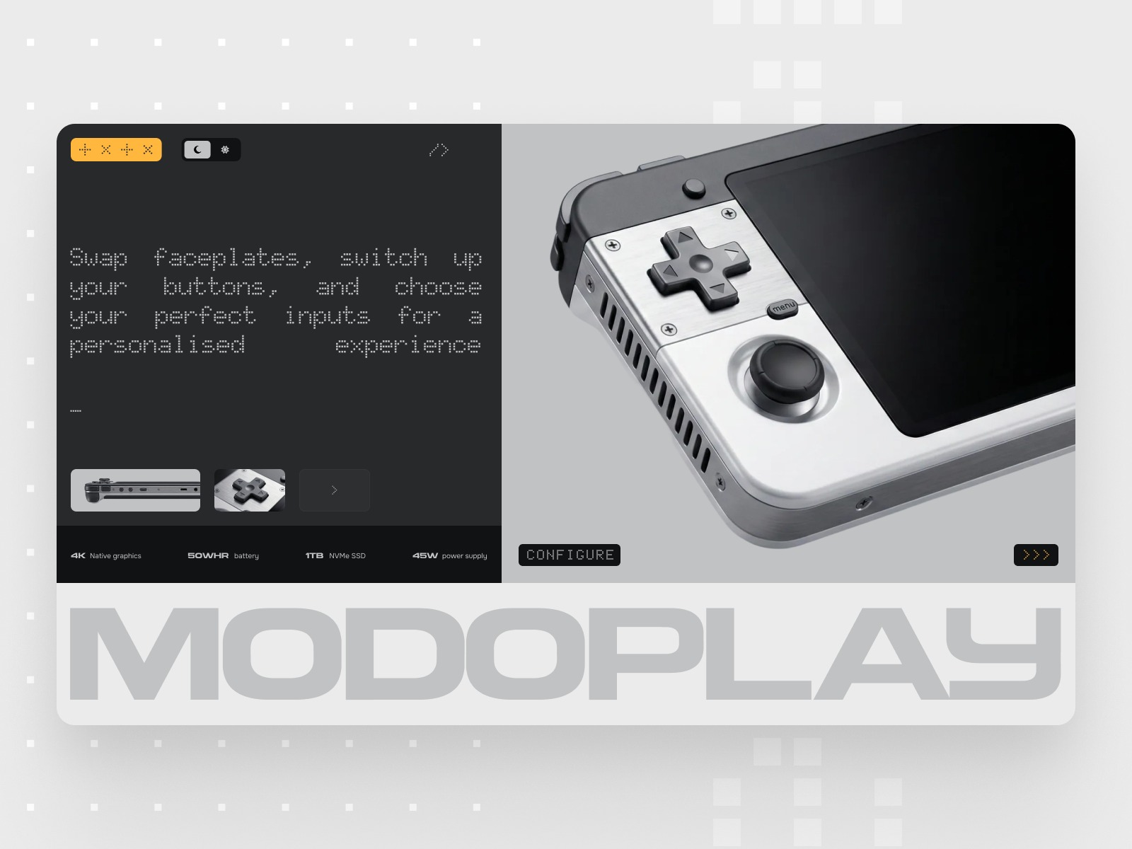 Diving into the world of industrial-led UI with Modoplay. This project is a fictional exploration into the intersection of customisable hardware and a stripped-back, tactile interface. The goal was to create a design system that feels as rugged modular, and technical as the device itself. Swipe to see the initial layout and hardware integration. All visuals were created with Nano Banana. Graphics created with craft.