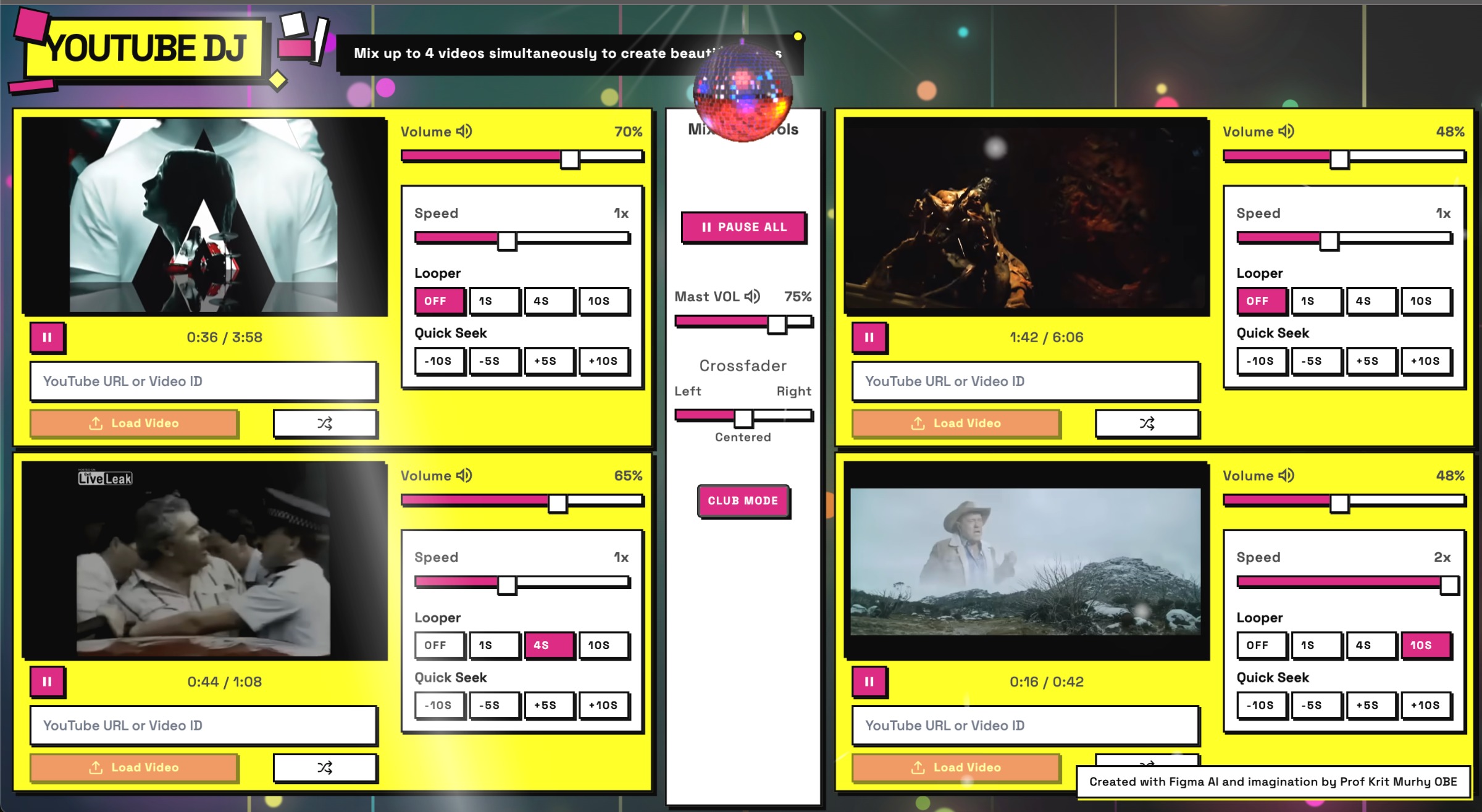 YouTube DJ 🎧🎶 YouTube DJ is a playful, chaotic, and endlessly entertaining experiment in remixing the internet. With YouTube DJ, you can: •🎛️ Mix up to four YouTube videos simultaneously •🔁 Loop and re-loop your favorite bits •⏩ Speed things up (or slow them way down) •🎚️ Crossfade between tracks like a pro •🕺 Flip into Club Mode for full-on party chaos It’s weird, it’s noisy, it’s bizarre—yet somehow it all comes together into something seriously fun. Whether you’re a bedroom DJ, a curious tinkerer, or just someone who likes to push YouTube into unexpected places, YouTube DJ is here to turn your tabs into a dancefloor.