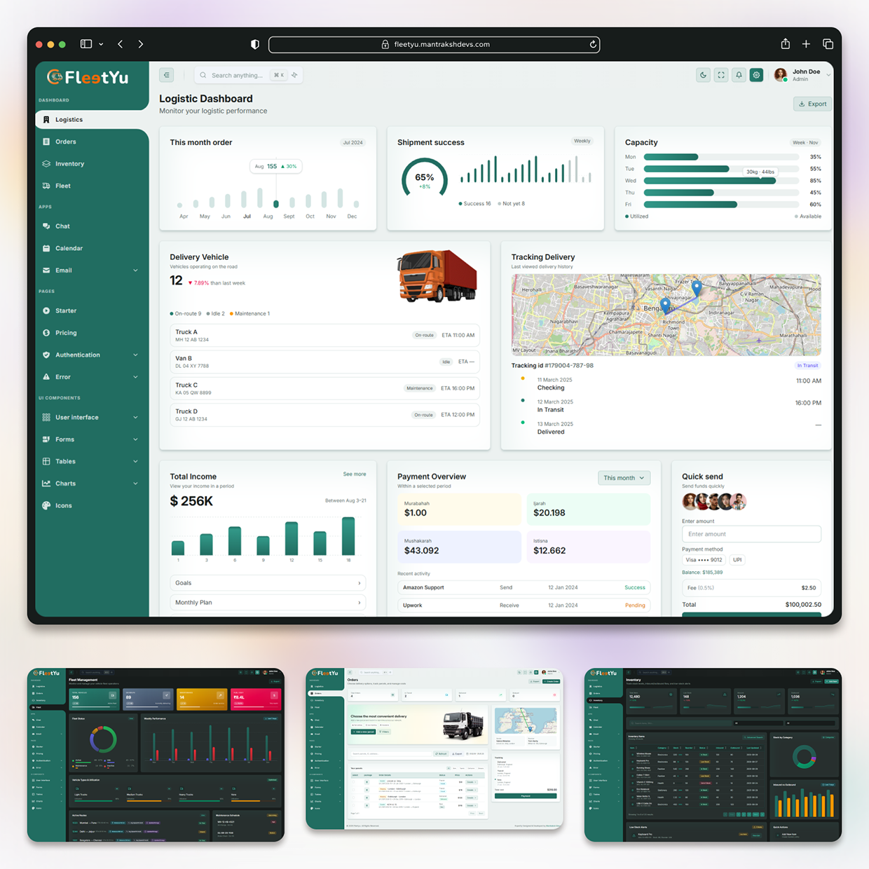 Fleetyu - Logistics & Fleet Management Admin Dashboard Fleetyu is a premium, production-ready React 19 admin dashboard designed specifically for the logistics, warehouse, and fleet management industry. Built with the cutting-edge Tailwind CSS 4, it offers a blazing-fast, modular, and highly scalable foundation for your next SaaS or enterprise project. Why Fleetyu stands out? ✅ Ultimate Layout Control: Full support for Vertical & Horizontal navigation styles. ✅ Global Ready: Seamless LTR & RTL switching with a single click. ✅ Day & Night: Stunning Light & Dark mode support for better accessibility. ✅ Advanced Tracking: Integrated with React-Leaflet for real-time map tracking. ✅ Developer-First: Built with React 19, Vite, and TanStack Table for ultimate performance. Main Highlights:- - 50+ Specialized Logistics Components - 4+ Dedicated Fleet Dashboards - Real-time Data Visualization (ApexCharts) - 100% Responsive & Pixel Perfect - Comprehensive 16-page Documentation Perfect for: Logistics SaaS, Supply Chain Portals, Inventory Management, and Delivery Tracking Systems. Experience the Innovation: 🌐 Live Demo & Docs: https://fleetyu.mantrakshdevs.com/documentation/