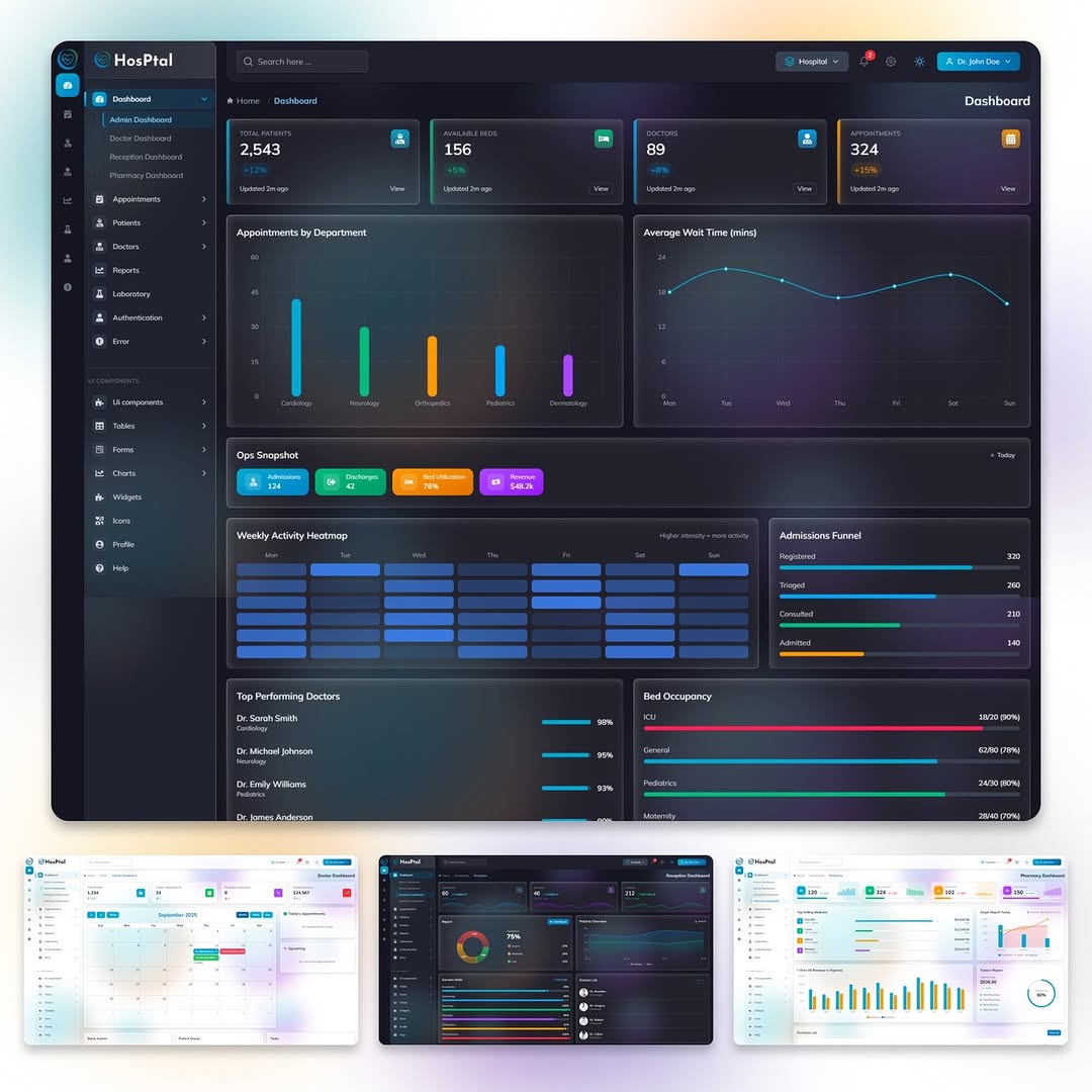 Hosptal β React Hospital Admin Dashboard Template Built with React 19 and Tailwind CSS 4.1 Role based dashboards: Admin, Doctor, Pharmacy RTL and Dark Mode support included Hosptal is a professional React Hospital Admin Dashboard Template, designed for healthcare, medical, and hospital management applications. Built with React 19 and Tailwind CSS 4.1, it provides a modern, responsive, and scalable solution for creating hospital dashboards and healthcare systems. Core Features React 19 + Tailwind CSS 4.1 for modern and fast development Role Based Dashboards: Admin, Doctor, Reception, Pharmacy Healthcare Modules: Patients, Appointments, Billing, Laboratory, Reports Pharmacy and Reception workflow management Dark Mode and RTL support for global usage Responsive design for desktop, tablet, and mobile devices Reusable components and clean folder structure Charts, tables, forms, and UI elements included Easy customization of colors, fonts, and layouts Well-structured and developer-friendly code Optimized performance and scalable architecture