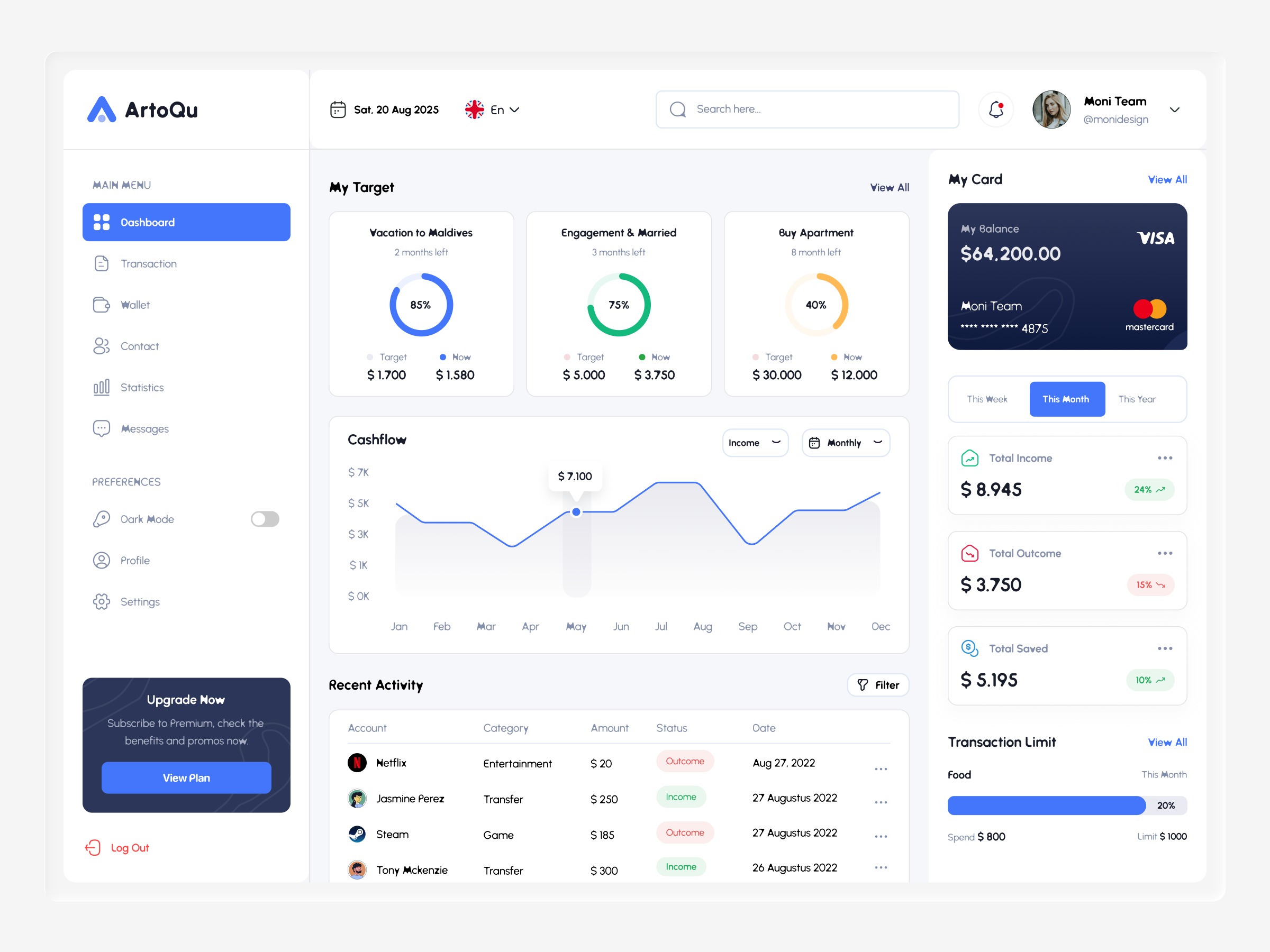 Our product design about Finance Management Dashboard called ArtoQu 💰 We focused on: ✨ Clean layout ✨ Bold typography ✨ Smooth UX flow ✨ Modern & vibrant visuals Hope you guys enjoy and like it ❤️ Any feedback? Feel free to leave comments below.