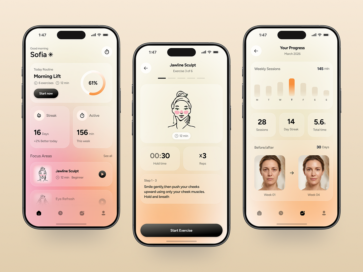 Overview A holistic digital companion designed to help users rejuvenate their skin and sculpt facial features through guided facial exercises. The app combines mindful movement with data-driven progress tracking to make facial fitness a seamless part of a daily beauty routine.