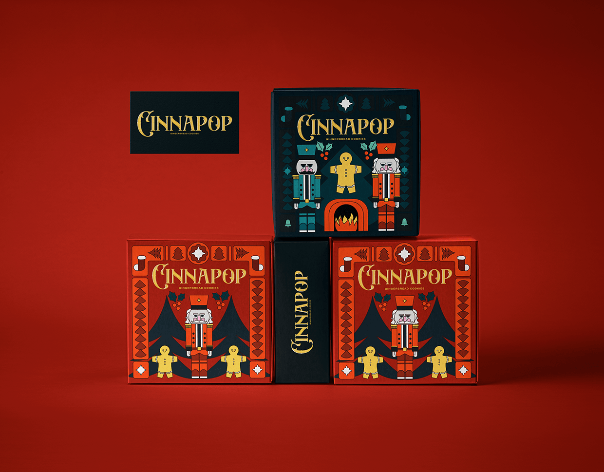 CINNAPOP is a playful gingerbread cookie brand rooted in holiday nostalgia, warmth, and bold festive character. Inspired by classic Christmas symbols, the identity blends cozy tradition with a clean, modern graphic style. The design uses strong shapes, rich seasonal colors, and clear outlines to keep everything crisp, scalable, and instantly recognizable. The result is a brand that feels comforting but confident — festive without being flimsy.