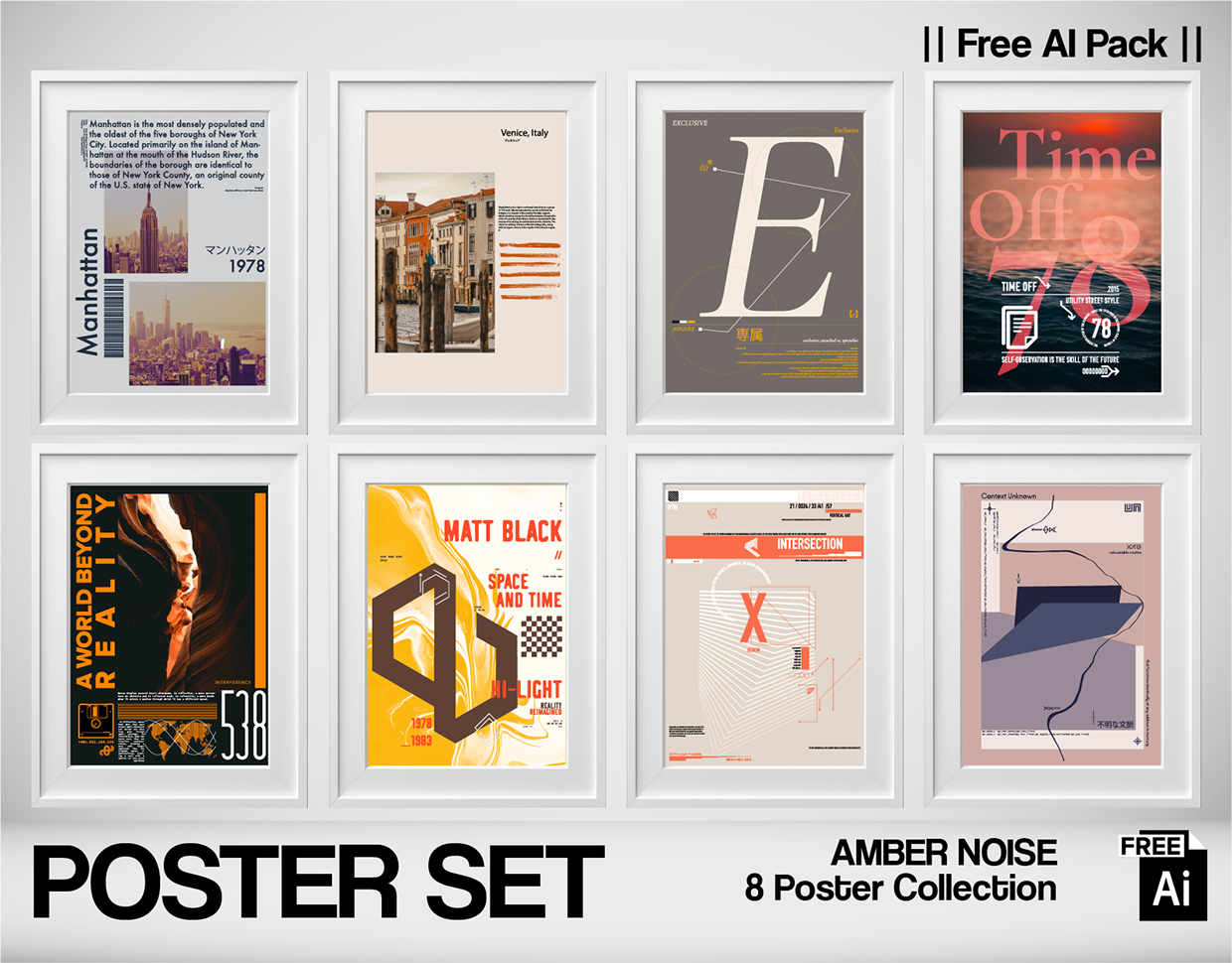 "AMBER NOISE" is a visual frequency dedicated to warmth, nostalgia, and analog aesthetics. Unlike the cold precision of digital blue, this collection explores the Earth Tones of the late 70s. We combined Architectural Brutalism with Vintage Editorial Layouts. The posters feature grain, sepia gradients, and typography that feels like a scanned magazine from 1978. The Collection Explores: Manhattan 1978 & Venice: Capturing the memory of a place using retro grids. Matt Black & Intersection: Abstract geometric studies in warm ochre and orange. Time Off: Visualizing the concept of "Pause" through typography. 100% Human-Crafted Vector Archive: Part of the Nospoon Vector Archive. Designed manually to capture the imperfect warmth of analog printing. No generative AI. Designed by Serkan Kosemek / Nospoon Visual Lab.