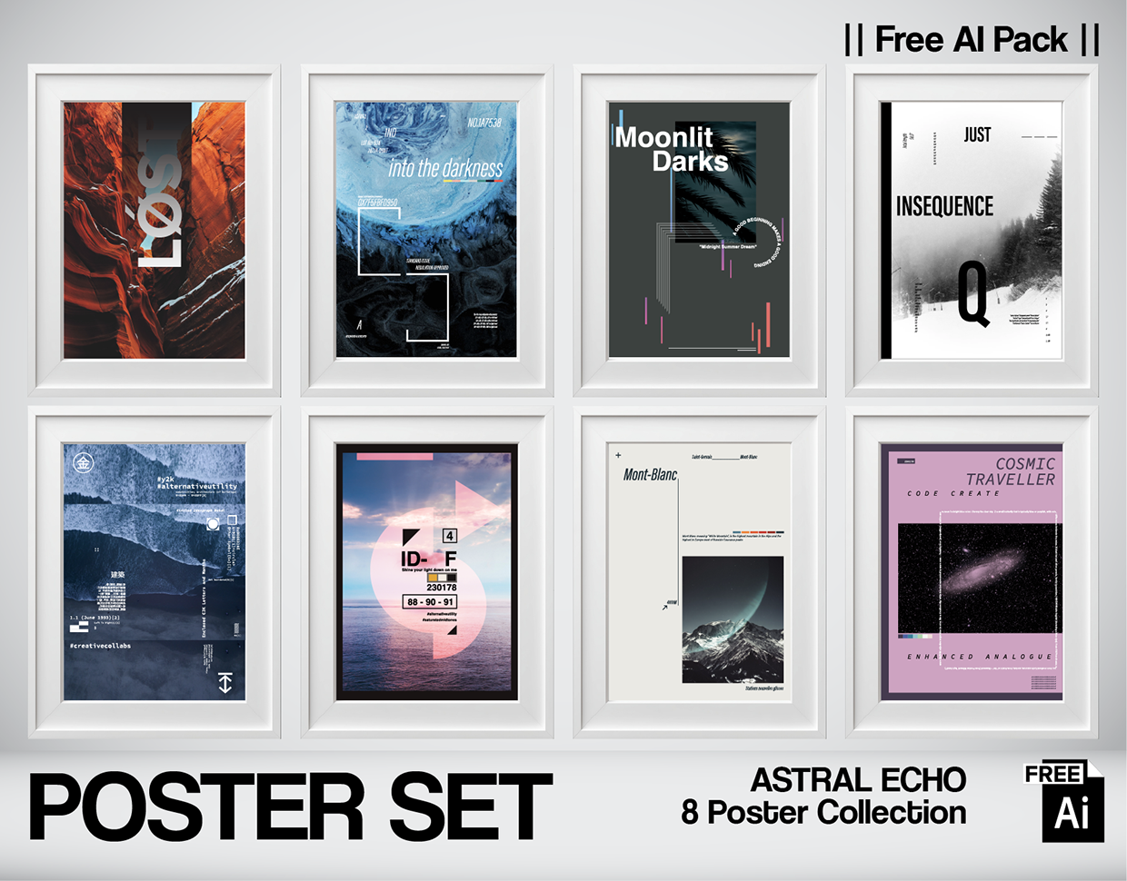 "ASTRAL ECHO" is a journey into the void. From the deep canyons of the earth to the outer edges of the galaxy, this collection explores the concept of "The Unknown." We moved away from strict grids to embrace Atmospheric Noise and Cinematic Typography. Visualizing themes like "Lost," "Into the Darkness," and "Cosmic Traveller," this set mixes nature photography with digital distortion and Y2K aesthetics. The Collection Explores: ** The Void:** The "LØST" poster uses canyon textures to create a sense of isolation. Cosmic Scale: Framing the galaxy in the "COSMIC TRAVELLER" poster with code-based typography. Atmosphere: The "Moonlit Darks" and "Mont-Blanc" posters focus on the silence of nature at night. Digital Nostalgia: The blue "Creative Collabs" poster brings back the raw, technical look of the early #Y2K era. 100% Human-Crafted Vector Archive: Part of the Nospoon Vector Archive. Designed manually to capture the mood. No generat Designed by Serkan Kosemek / Nospoon Visual Lab.