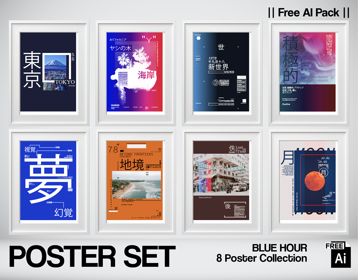 After the noise comes the silence. "BLUE HOUR" is a collection dedicated to the mood of twilight. That specific moment between day and night where everything turns deep blue and cinematic. This set moves away from aggressive distress to explore Atmospheric Gradients, Swiss-Japanese Typography, and Editorial Layouts. It feels like a travel magazine from a cyberpunk future. The Collection Explores: Tokyo & Moon: The interplay between deep indigo backgrounds and stark white Kanji characters. California & Frontiers: Using negative space and typography to frame landscape photography. Dream & Illusion: Pure typographic studies on vertical rhythm and hierarchy. 100% Human-Crafted Vector Archive: Part of the Nospoon Vector Archive. Every typographic composition and color grade was crafted digitally by human hand. No generative AI. Just pure editorial discipline. Designed by Serkan Kosemek / Nospoon Visual Lab.