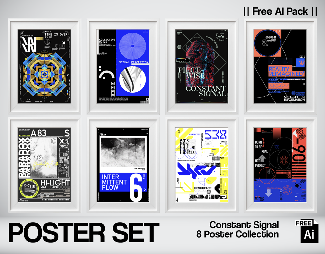 Constant Signal is a free experimental poster collection exploring how meaning, perception, and information behave inside contemporary visual systems. This 8-poster set focuses on signals that never fully stop — sometimes clear, sometimes fragmented, sometimes distorted — combining typographic structures, abstract geometry, data fragments, and editorial layouts. Each poster operates as a visual experiment rather than a final statement, allowing designers to study rhythm, hierarchy, noise, and contrast inside modern graphic language. All files are shared freely for learning, remixing, and visual exploration.