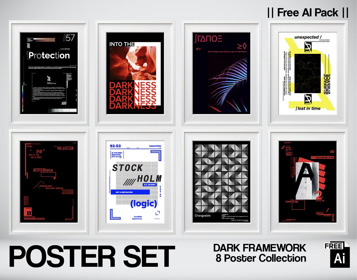DARK FRAMEWORK is an experimental poster collection built around fragmented grids, neon highlights, and distorted typographic systems. Each composition explores how logic, structure, and unpredictability coexist inside a visual environment. The series blends: – high-contrast monochrome fields – red / electric blue / neon-lime accents – typographic repetition and broken alignment – motion-blur imagery and abstract geometry – modular information blocks, coordinates, and code-driven layouts Across the eight posters, the language shifts between cyber aesthetics, minimal noir, Scandinavian grid discipline, and graphic decomposition. Some pieces work through repetition and pressure (“DARKNESS”), while others explore spatial logic (“Stockholm / logic”), texture abstraction, or manipulated light forms. All visuals were designed as A3-oriented vector-driven compositions, built layer by layer to echo a contemporary experimental print atmosphere.