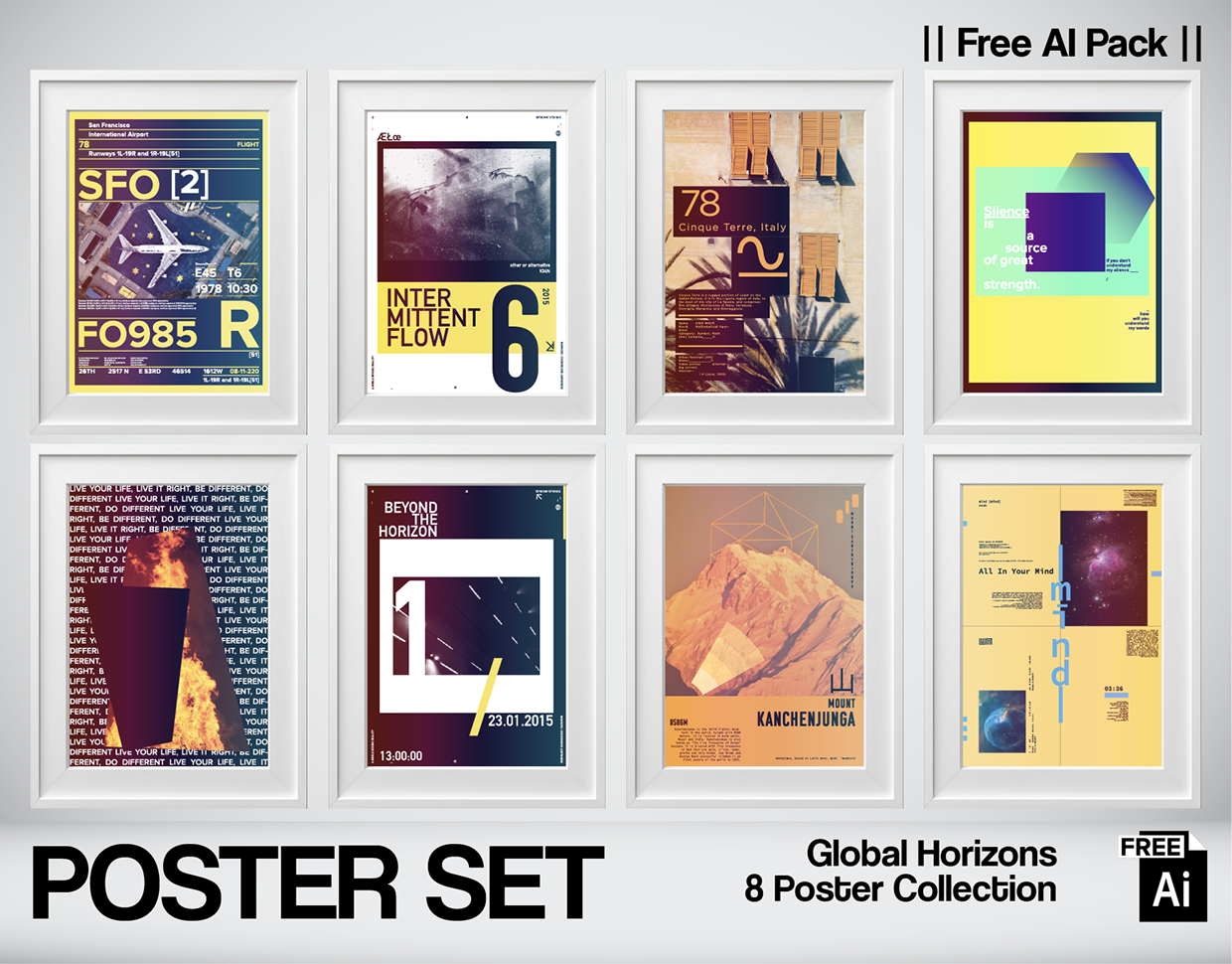 Every journey starts with a coordinate. As the founder of Nospoon Visual Lab, I invite you to a global exploration through my latest 8-piece poster collection: "Global Horizons." This series is a typographic flight that begins at San Francisco International Airport (SFO), crosses through the quiet strength of Cinque Terre, and reaches the majestic peaks of Mount Kanchenjunga. In this project, I explore the contrast between technical travel data (runways, flight numbers) and the poetic silence of the natural world. My 20-year background in textile design continues to guide my hand, creating a rhythm where "Intermittent Flow" meets rigid architectural structures. It's an exploration of the mind, the earth, and the grid.