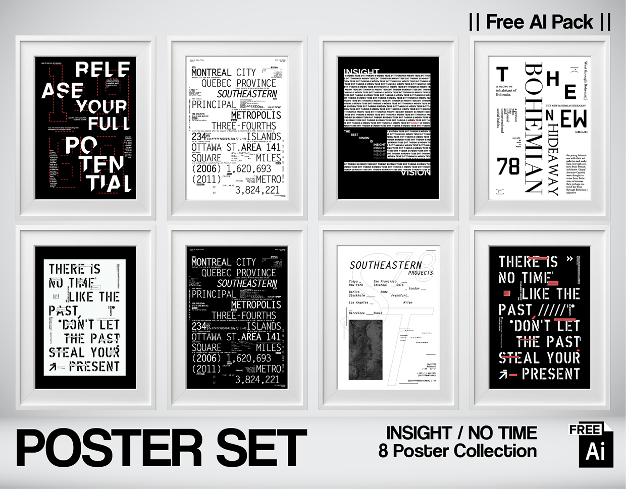 INSIGHT / NO TIME is a free experimental poster set focused on typography as structure, message, and system. This 8-poster collection explores statements, repetition, interruption, and editorial rhythm, using dense text blocks, typographic hierarchy, urban references, and minimal graphic interference. Rather than illustrating ideas, these posters declare them — functioning as visual notes, fragments of thought, or editorial interruptions inside contemporary graphic language. All files are shared freely for learning, remixing, and typographic exploration.