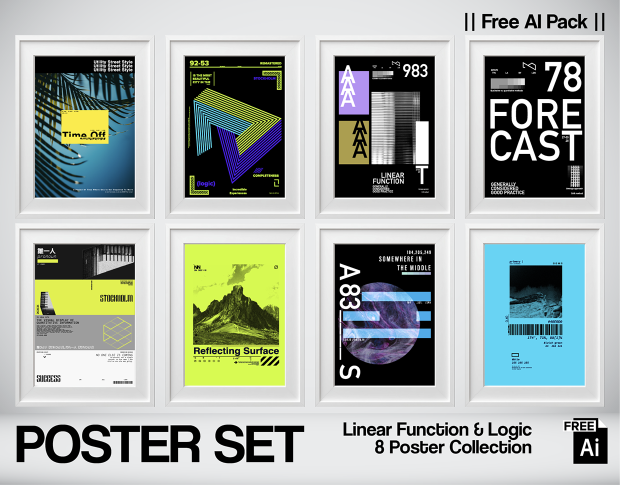 A visual exploration of urban logic and quantitative information design. This 8-piece collection translates architectural silhouettes and data structures into a cohesive brutalist language. Blending monochromatic palettes with Stockholm Green and Signal Yellow, the series examines the tension between reflecting surfaces and rigid grid systems. Each layout serves as a technical blueprint where typography acts as a structural element.