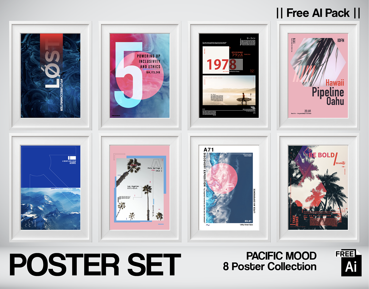 "PACIFIC MOOD" is a visual tribute to Surf Culture, Ocean Aesthetics, and West Coast Minimalism. This collection captures the endless summer vibe, moving from the shores of Hawaii to the streets of Palm Springs. We combined vibrant ocean blues with typographic layouts inspired by vintage surf magazines. It’s breezy, bold, and energetic. The Collection Explores: Hawaii & Cali: Typography meeting palm trees and coastal photography. Lost & Azure: Abstract representations of water textures and deep blue tones. 1978 Surf Beaches: A nod to the golden era of European surf culture. 100% Human-Crafted Vector Archive: Part of the Nospoon Vector Archive. Every layout and color grade was crafted digitally by human hand. No generative AI. Just pure summer vibes. Designed by Serkan Kosemek / Nospoon Visual Lab.