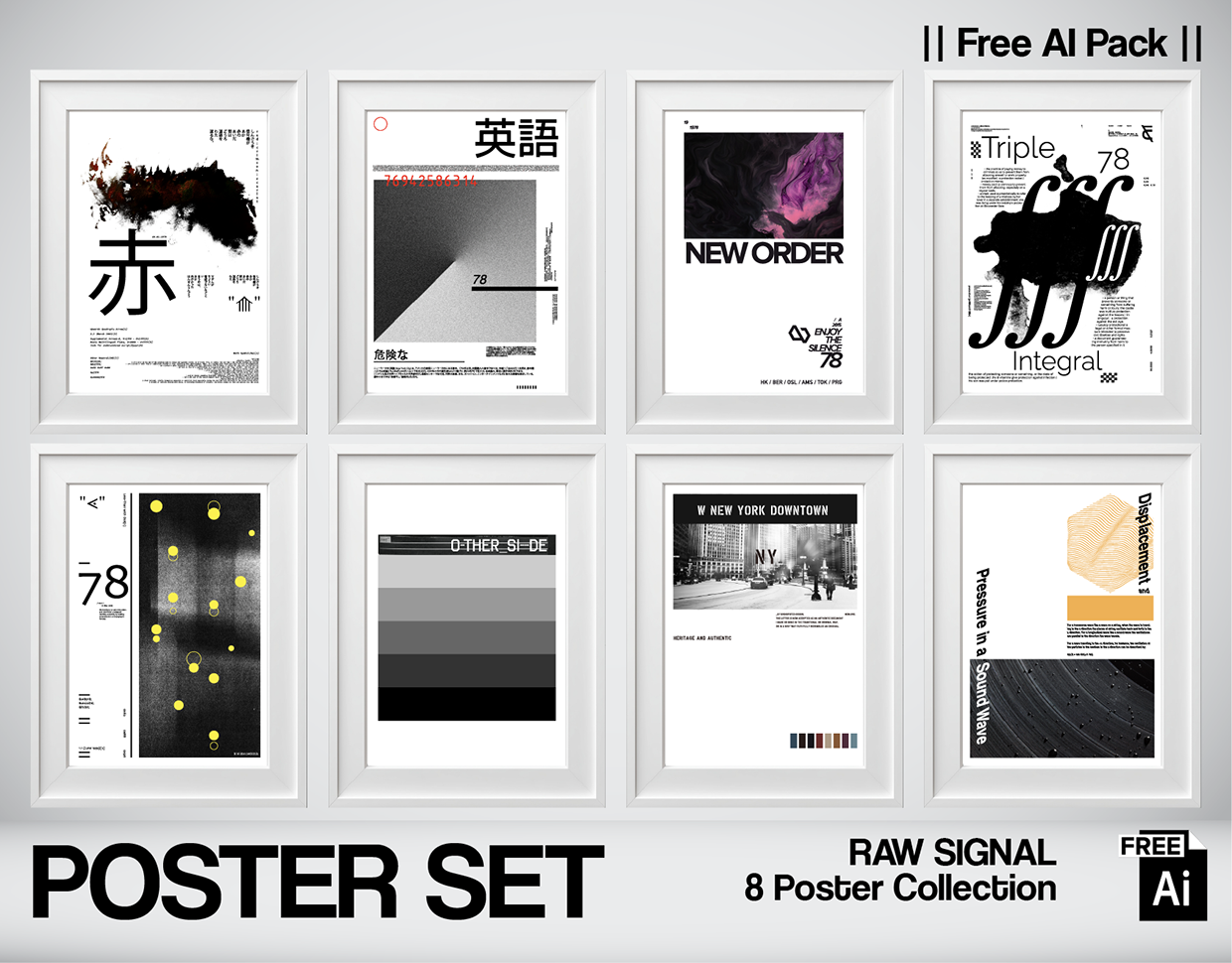 Design is not always about cleanliness; sometimes it’s about the mess. "RAW SIGNAL" is a collection dedicated to Experimental Typography, Analog Textures, and Visual Noise. This set breaks away from the strict Swiss Grid to embrace a more chaotic, "Zine-like" aesthetic. We blended traditional media (Ink splatters, distressed paper) with digital precision (Vector typography, Sound waves). The Collection Explores: Analog vs. Digital: The clash between traditional Japanese calligraphy and modern vector layouts. Visual Noise: Utilizing grain, displacement maps, and sound waves as primary graphic elements. Deconstructed Type: Typography that is cut, distorted, and layered to prioritize emotion over legibility. 100% Human-Crafted Vector Archive: This project is part of the Nospoon Vector Archive. Every ink splatter and vector path was crafted digitally by human hand. No generative AI was used. We believe in the beauty of manual imperfection. Designed by Serkan Kosemek / Nospoon Visual