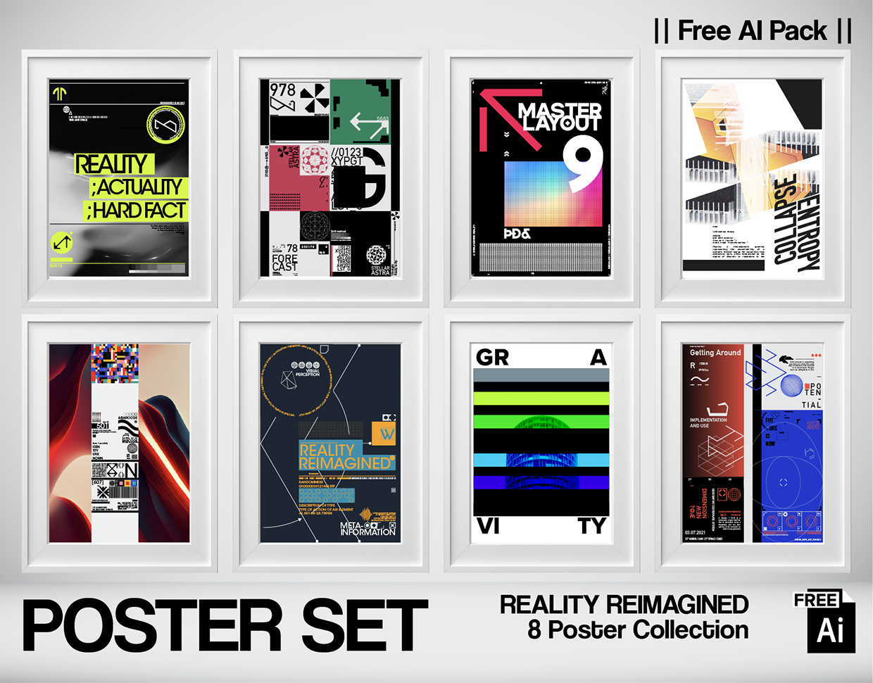 Decoding the Visual Environment. "Reality Reimagined" is a systematic investigation into information theory, entropy, and the limits of visual perception. This 8-piece collection explores the boundary between chaotic data and structured layouts, treating typography as a spatial element within a digital blueprint. Utilizing a high-frequency color palette and complex geometric layering, the series examines concepts of "Collapse Entropy" and "Visual Logic." Each poster serves as an analytical framework, blending technical iconography, coordinate systems, and master layouts to re-evaluate the way we process visual information in a technological age.