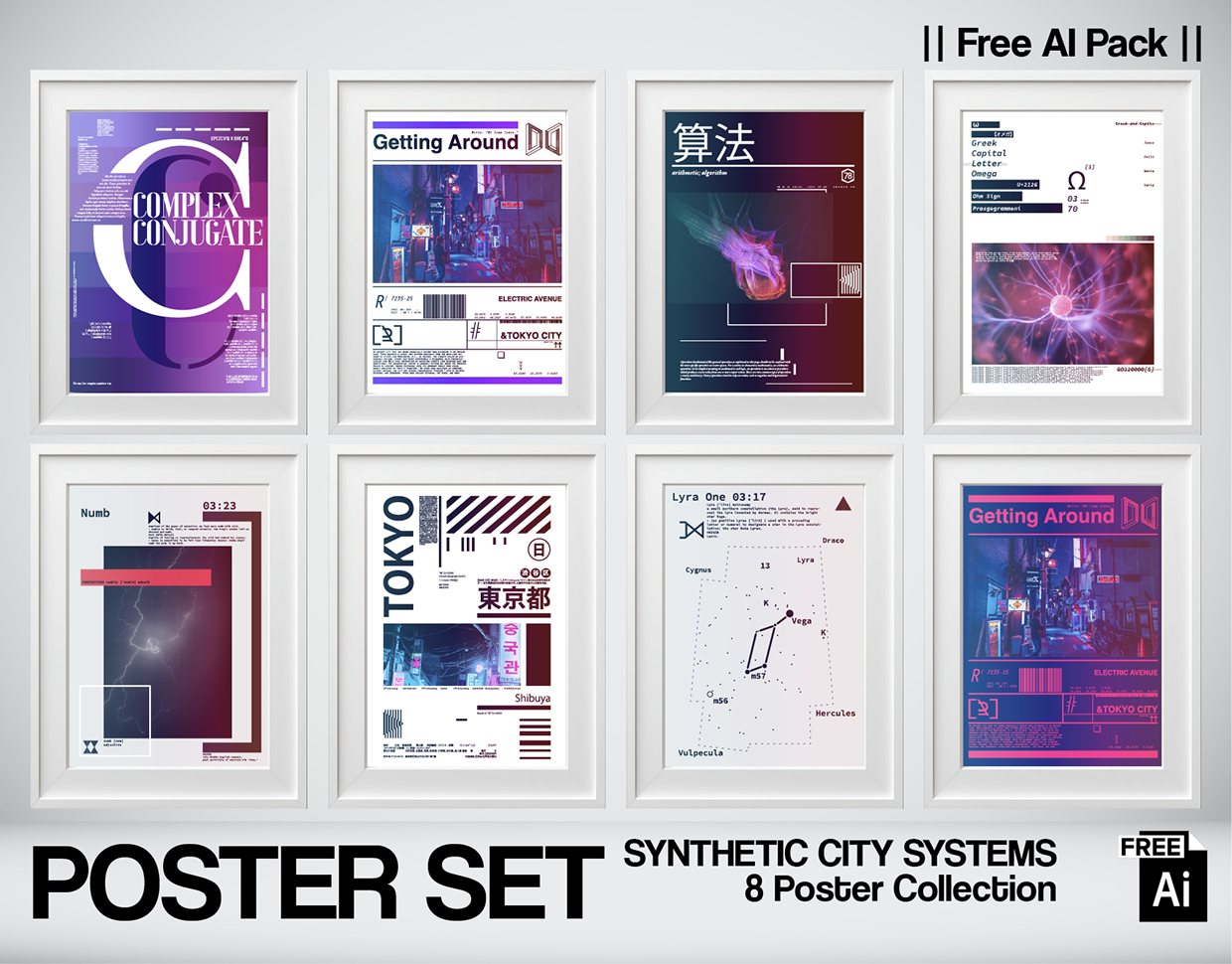 Synthetic City Systems is a poster series exploring the intersection of urban environments, mathematical language, and digital emotion. Each composition combines structured grids, coded typography, scientific notation, and city references to create a visual system rather than a single image. The series moves between logic and atmosphere — where data meets neon, and geometry meets intuition. Inspired by Tokyo street culture, algorithmic thinking, and contemporary editorial design, these works function as visual experiments. This collection investigates: • Mathematical symbolism in graphic form • Urban data aesthetics • Code-based typography • Neon gradient structures • Editorial poster systems Not just cities. Not just design. A synthetic layer between structure and sensation.