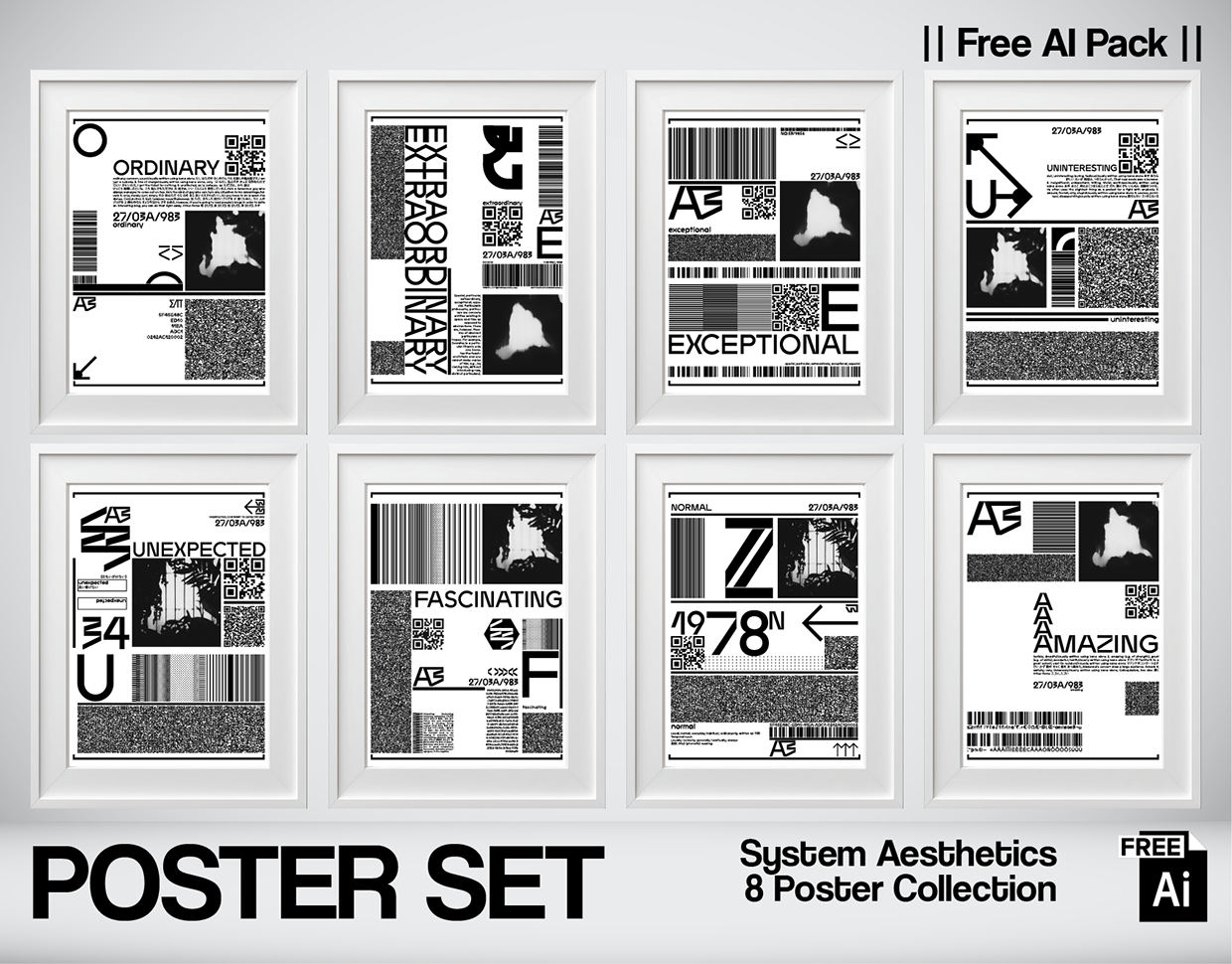 Defining the Extraordinary. "27/03A/983" is a systematic investigation into the visual representation of abstract concepts through digital noise, barcode structures, and brutalist typography. This 8-piece collection explores the semantic boundaries between words like "Ordinary," "Exceptional," and "Fascinating" within a high-contrast information environment. Utilizing QR code integration, grain textures, and rigid grid systems, the series treats typographic layouts as raw data dockets. Each poster is an exercise in deconstructing visual perception, blending industrial coding aesthetics with contemporary editorial design to reframe how we categorize reality.