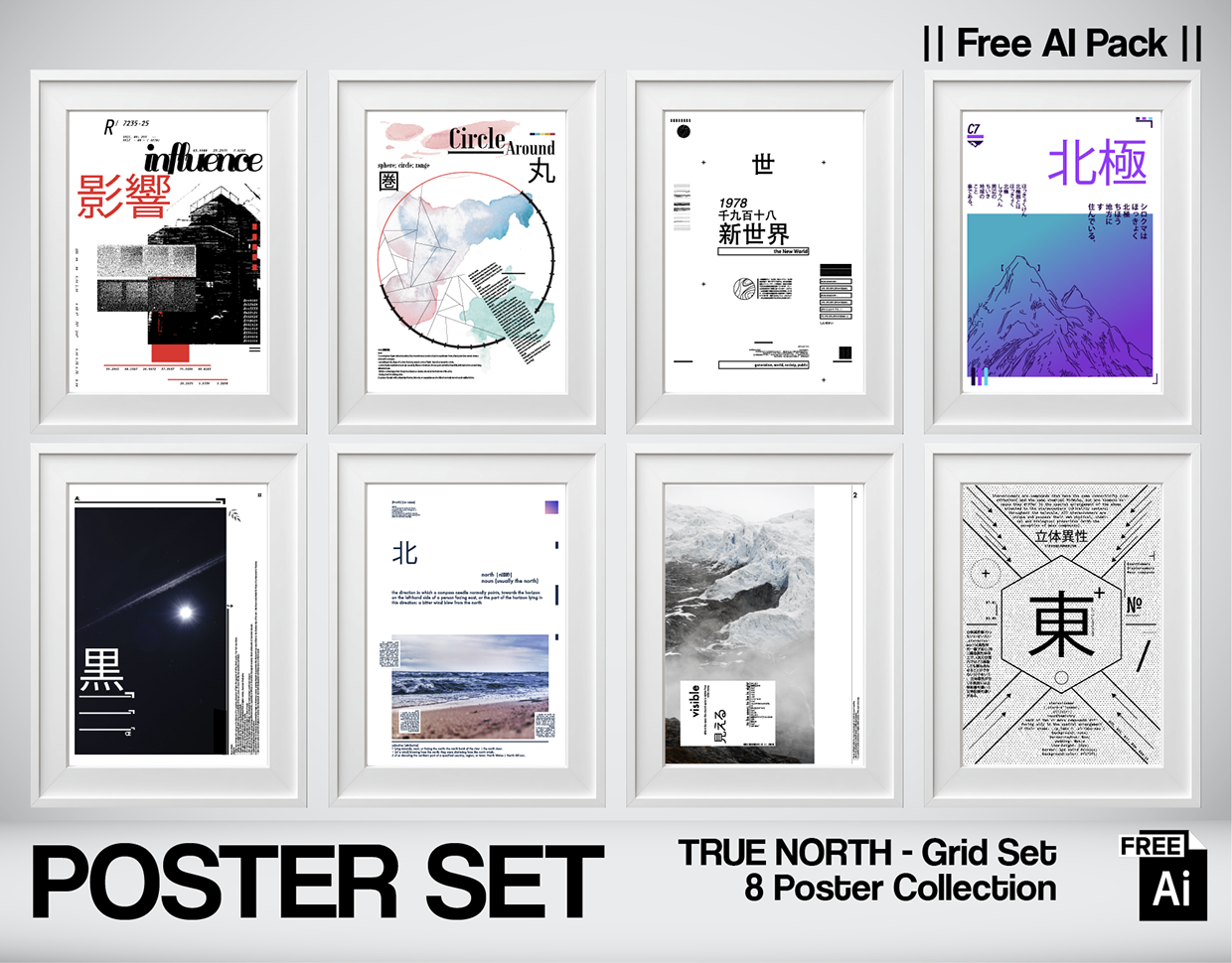 "TRUE NORTH" is a search for direction. After exploring the dark in our previous sets, this collection returns to the light. It focuses on Orientation, Science, and Typography. We combined Encyclopedia Aesthetics with Swiss Design Grids. The posters serve as visual definitions of concepts like "North," "Influence," and "Stereoisomerism." It is where organic nature meets the rigid grid of a map. The Collection Explores: Cardinal Directions: Visualizing "North" and "East" through Kanji and dictionary definitions. Science & Structure: Using molecular diagrams and stereochemistry grids as decorative elements. Ice & Void: High-key photography of glaciers and white space to create a sense of vastness. 100% Human-Crafted Vector Archive: Part of the Nospoon Vector Archive. Designed manually to find the perfect balance between image and text. No generative AI. Just pure layout discipline. Designed by Serkan Kosemek / Nospoon Visual Lab.