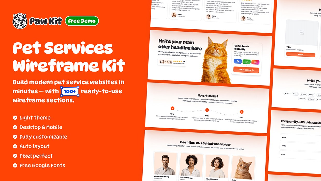 Pet Services Landing Page Wireframe Kit for Figma — a free demo file with ready-to-use sections and a component library for fast desktop + mobile layouts.